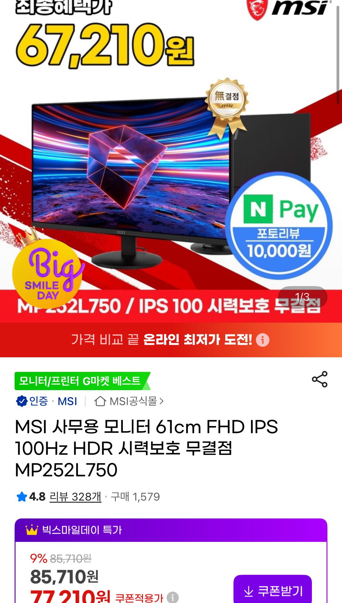 [G마켓] MSI MP252L750 IPS 100 시력보호 무결점 (77,210원/무배) > 국내핫딜