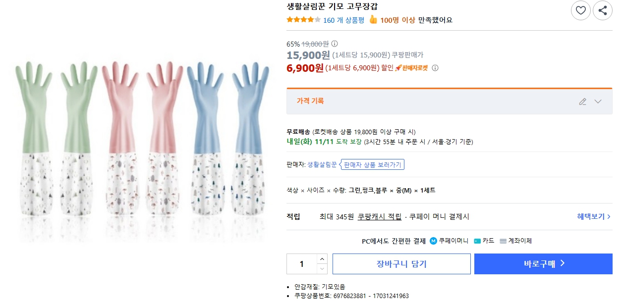 [쿠팡] 기모 고무장갑 3개세트+ 싱크대 음식물 거름망 100P 증정 (6,900/무료)