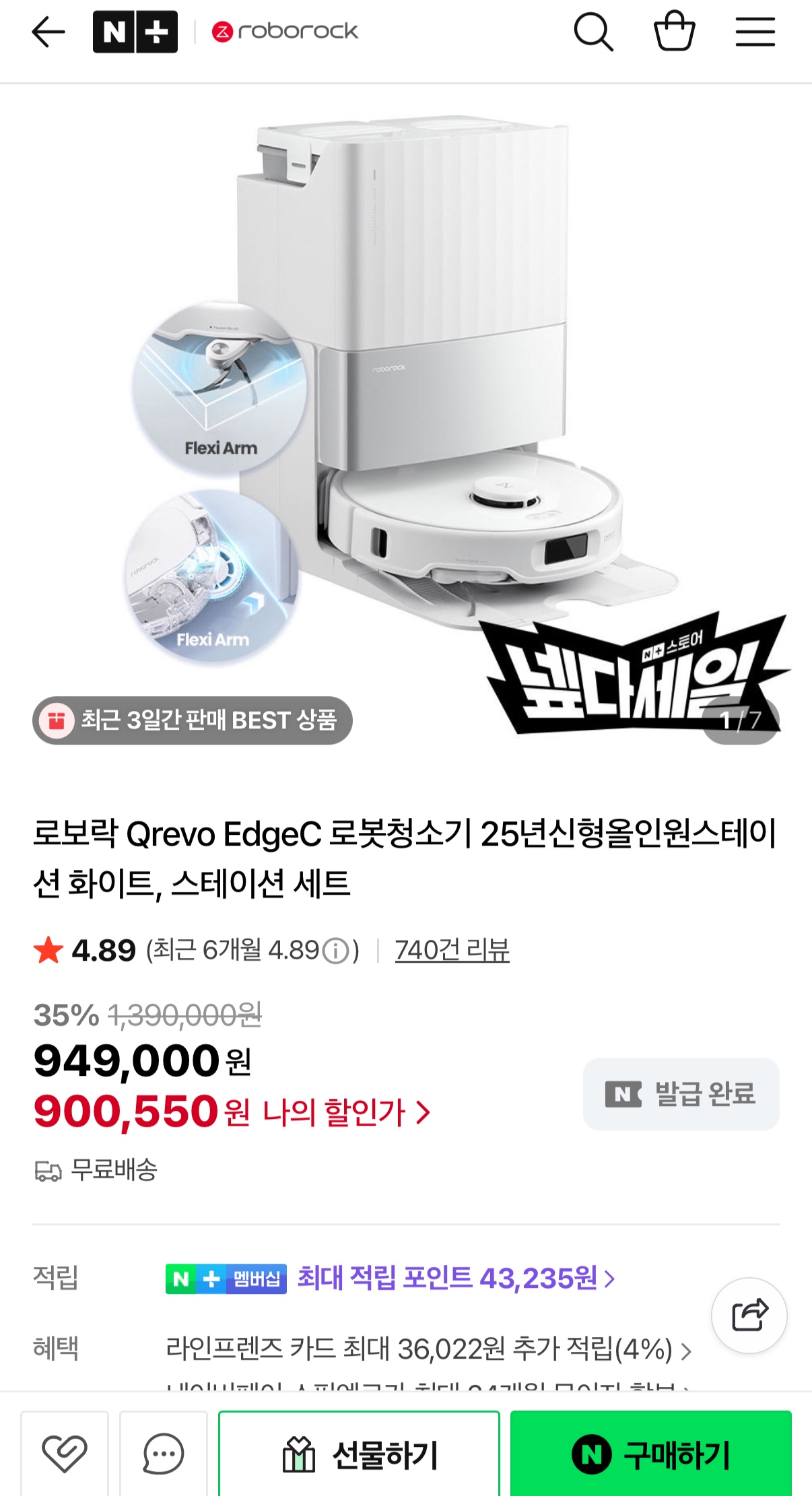 [네이버]로보락 Qrevo EdgeC 로봇청소기 25년신형 외 H60 pro (900,550원/무료)