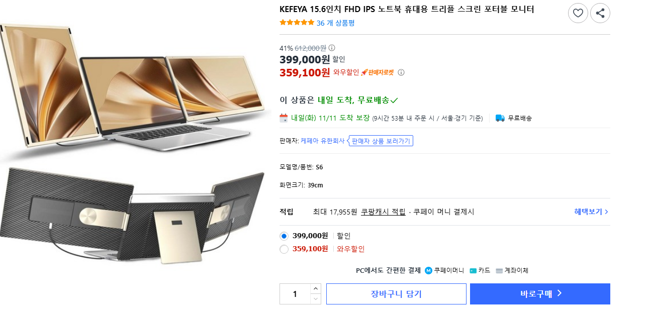 KEFEYA 15.6인치 FHD IPS 휴대용 트리플 포터블 노트북 모니터(359,100원/무배)