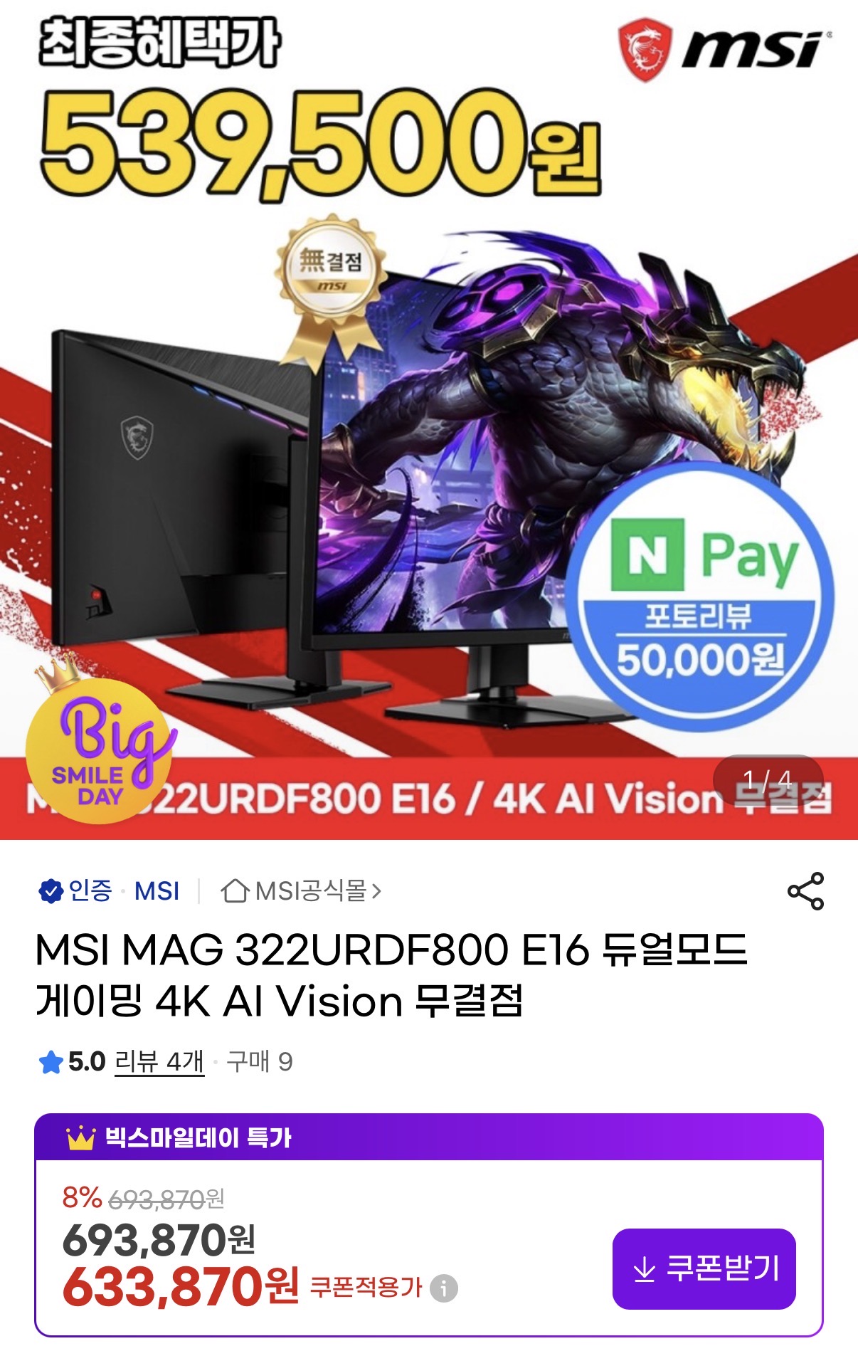 [지마켓] MSI MAG 322URDF800 E16 듀얼모드 게이밍 4K AI Vision 무결점 (589,500원/무배)