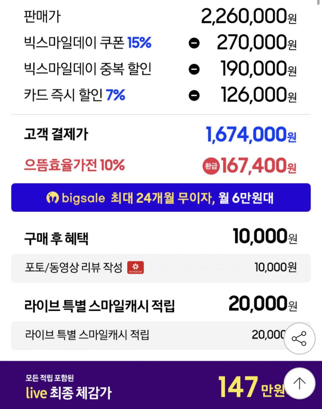 여기에 으뜸효율 환급 10% + 리뷰 1만원 + 라이브 적립 2만원까지 포함하면 체감가 약 147만원대예요