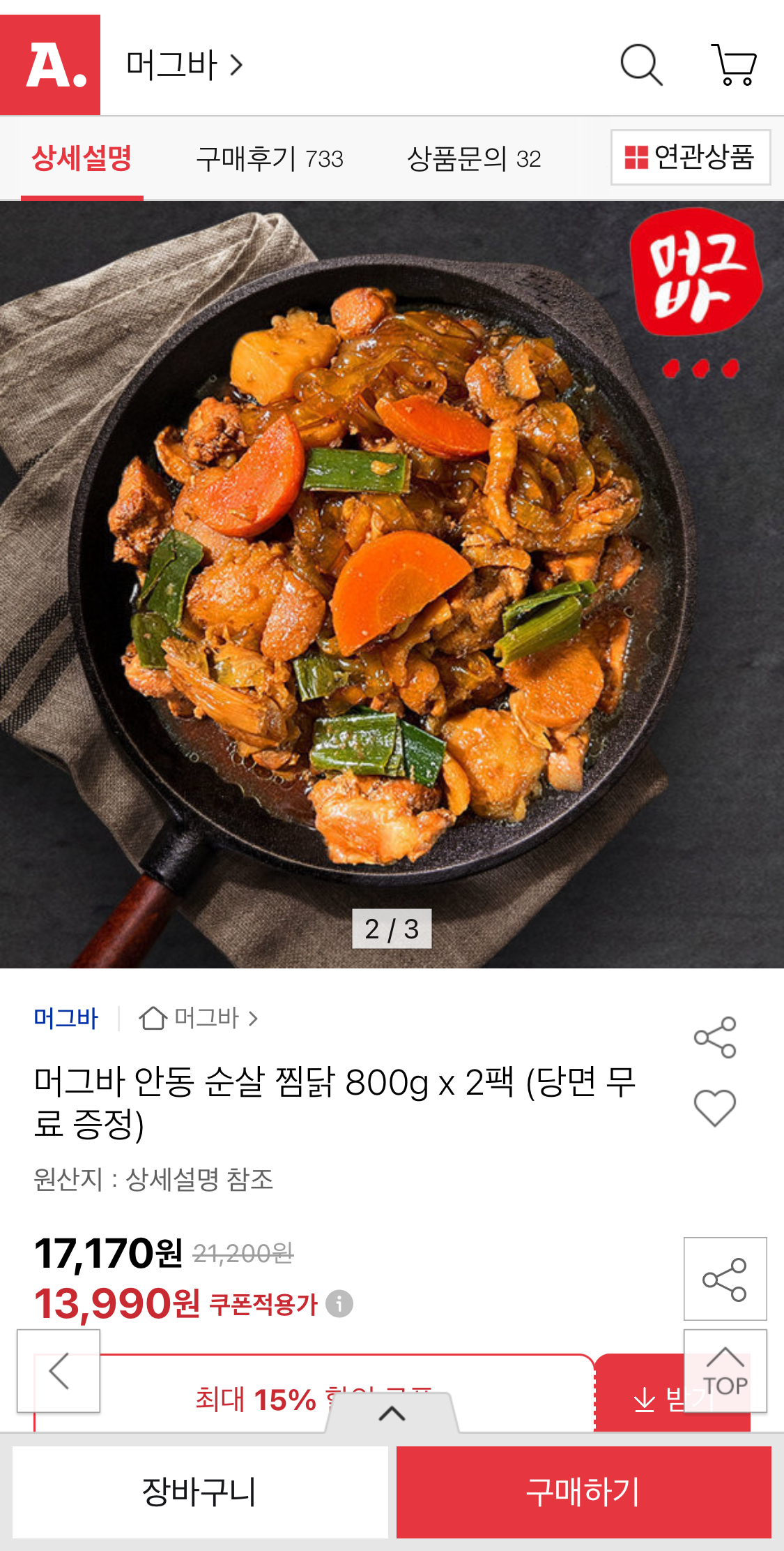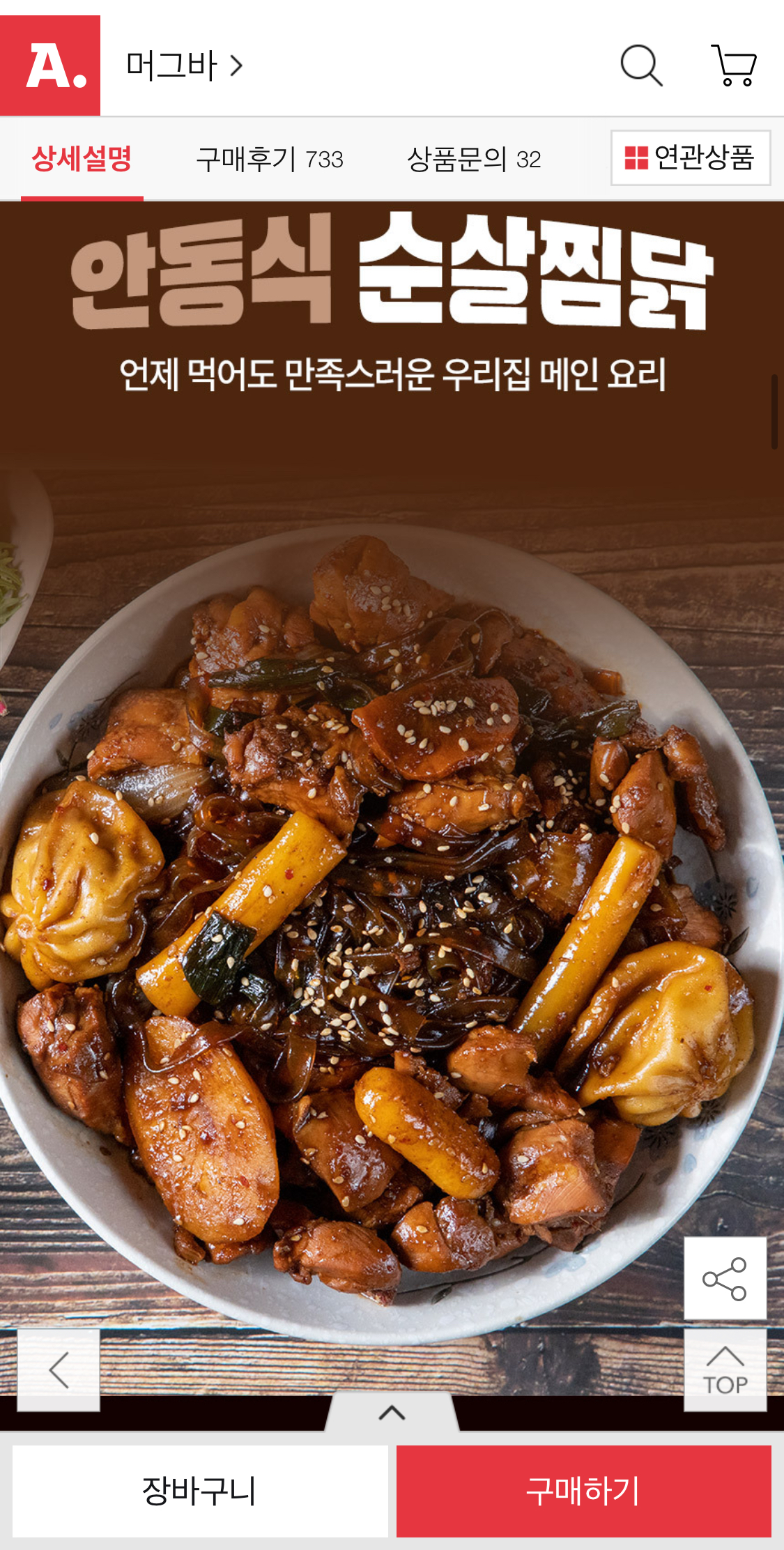 [옥션] 머그바 안동 순살 찜닭 800g x 2팩 (당면 무료 증정) (13,010원/무배) > 국내핫딜