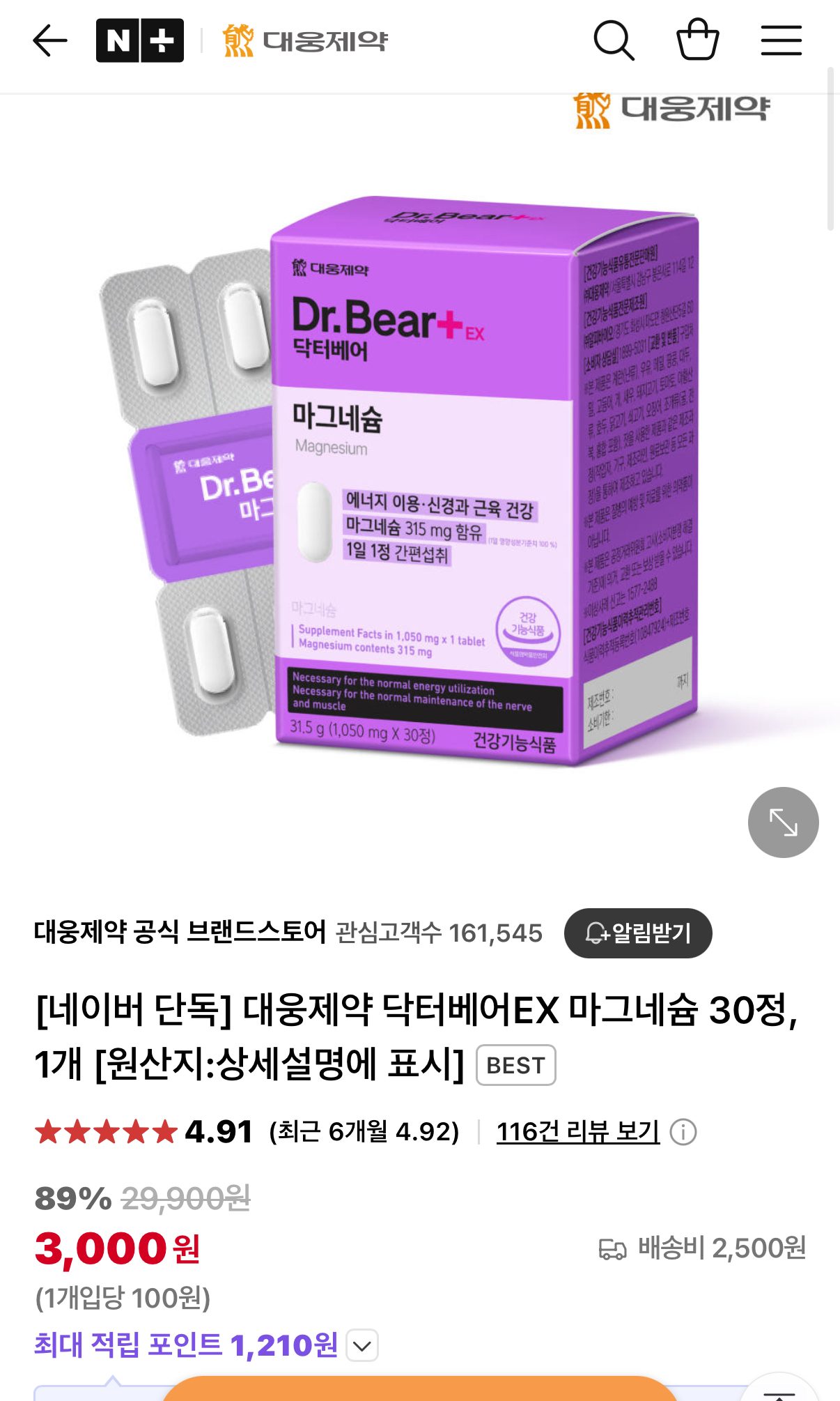 [네이버] 대웅제약 닥터베어EX 마그네슘 30정(3,000원/2,500원) > 국내핫딜