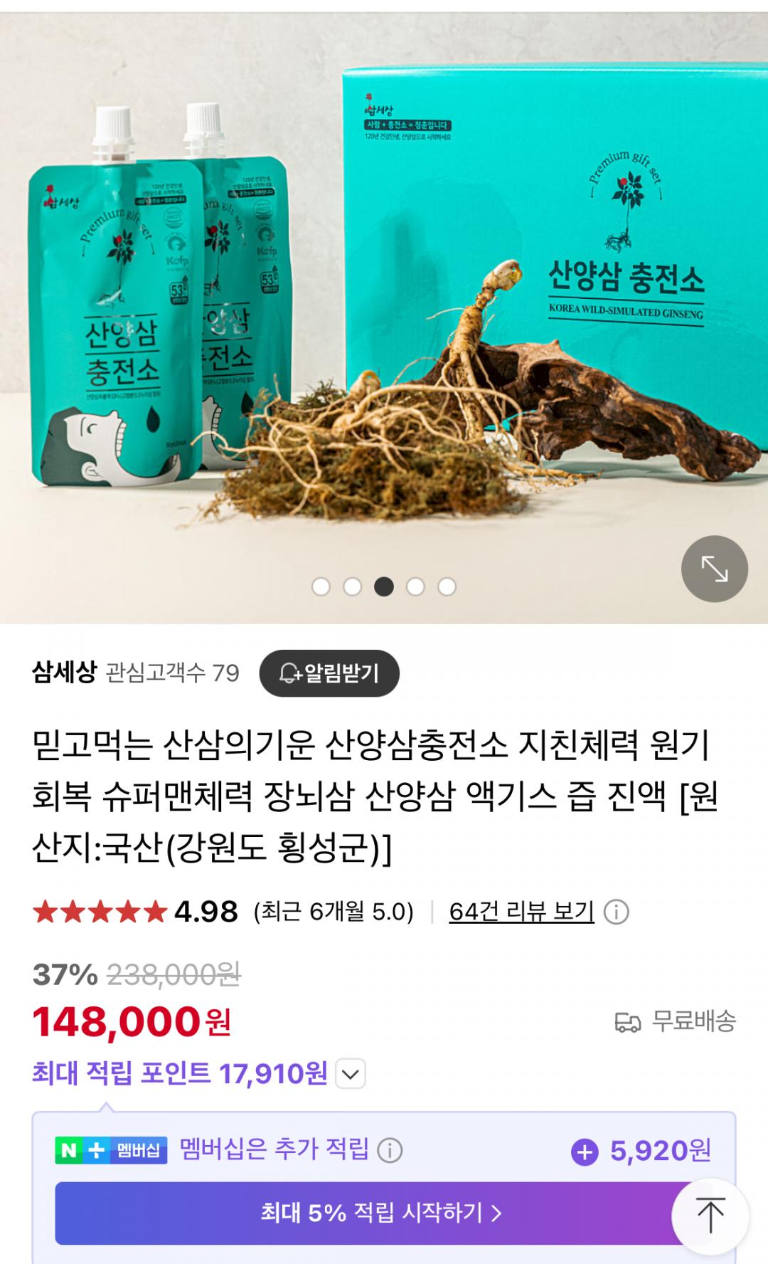 [네이버] 산양삼충전소 산삼즙 1박스(30포) (148,000원/무배) > 국내핫딜