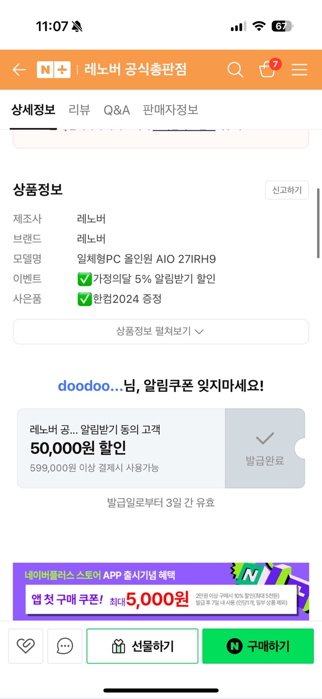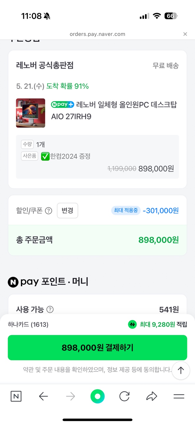 할인 25만원인데 알림받기하니 할인 혜택 붙어 898,000원에 구매 가능해서