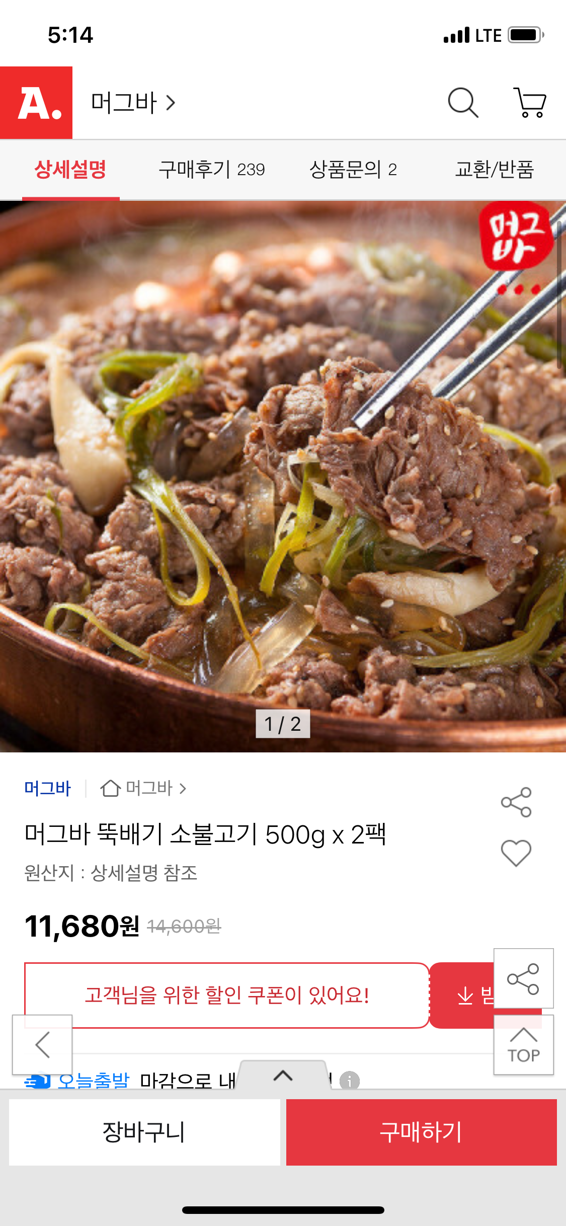 [옥션] 머그바 뚝배기 소불고기 500g x 2팩 (11330원/무배) > 국내핫딜