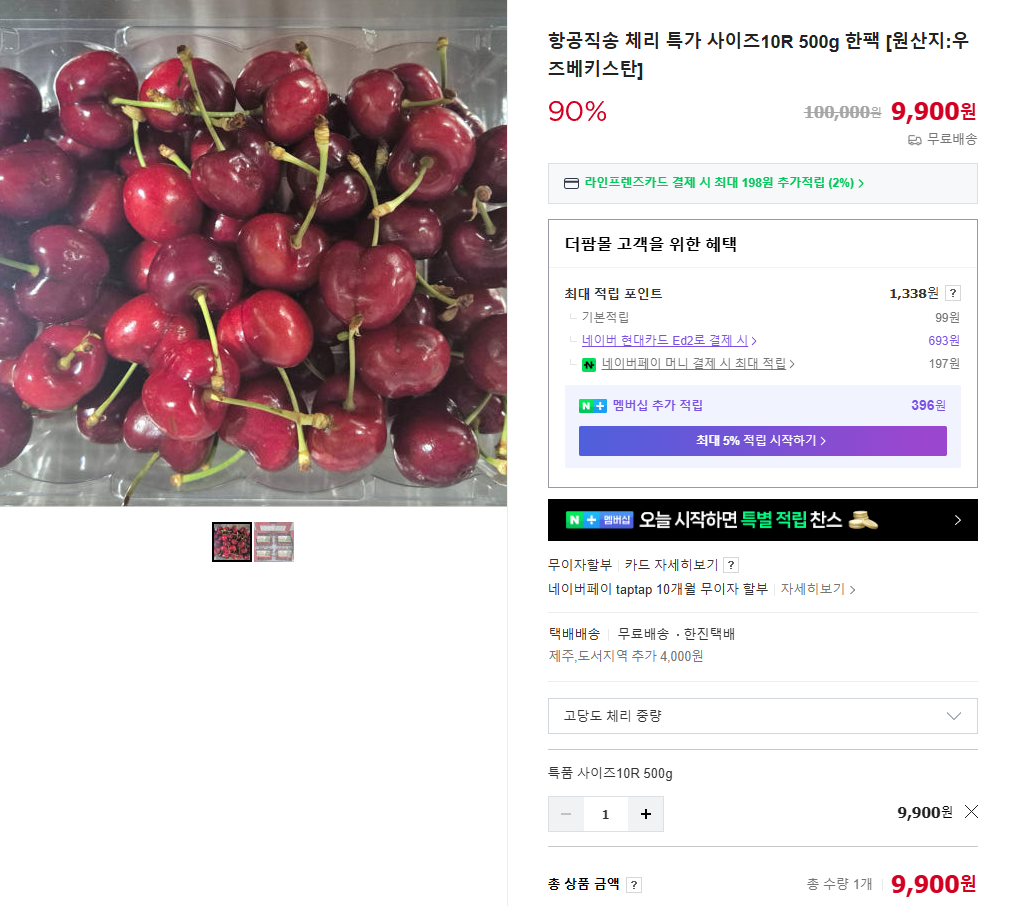 [네이버] 항공직송 체리 500g (9,900원 / 무료)