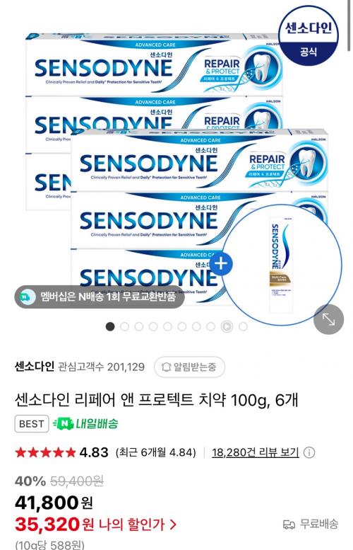[네이버] 센소다인 리페어 앤 프로텍트 치약 100g, 6개 (41,300원/무료)