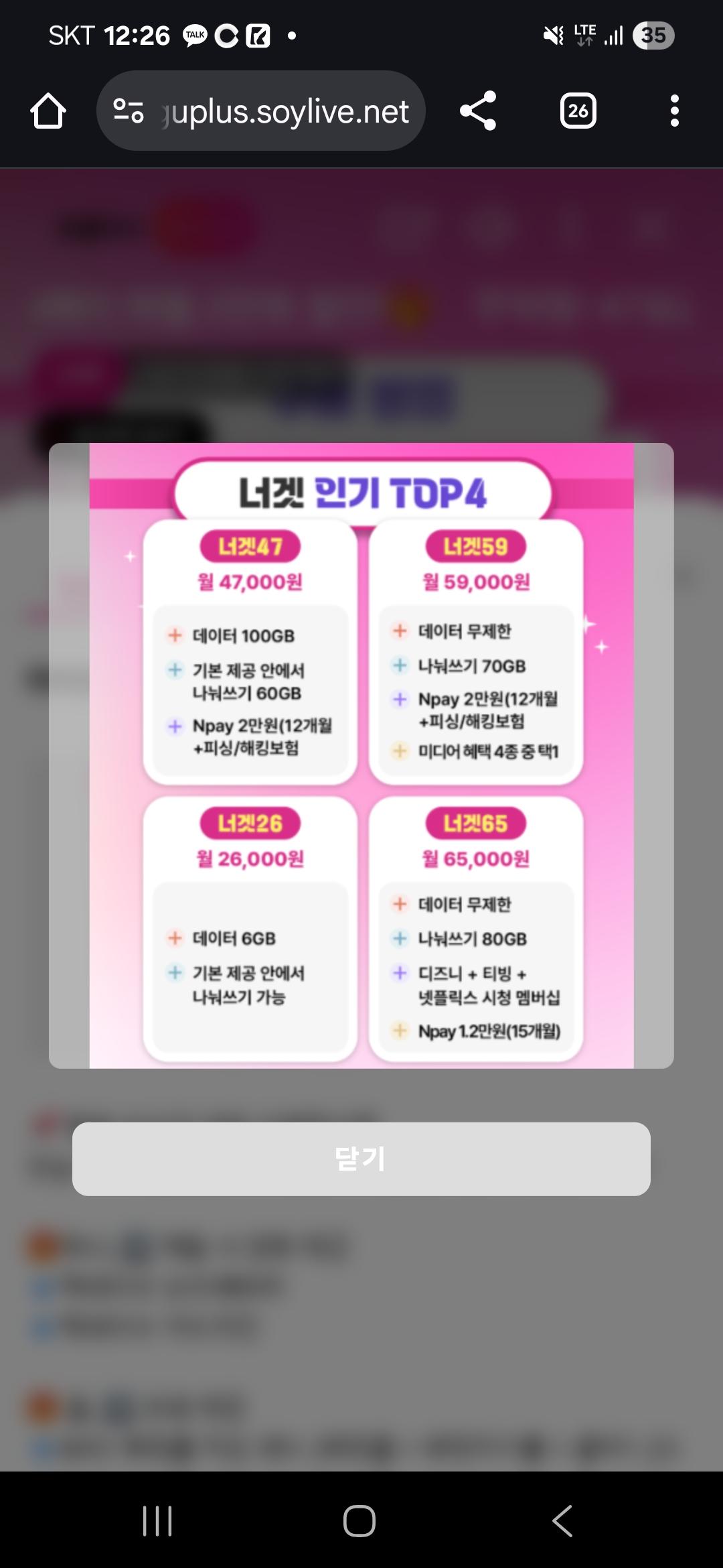 [유플 라이브] 너겟 47요금제 체감가 월 27,000원에 무제한 (47,000원/무료) > 국내핫딜