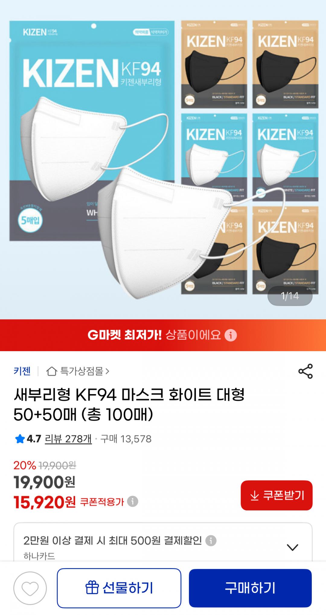 [G마켓] KF94 새부리형 여름 마스크 100매 (15,920원/무배)