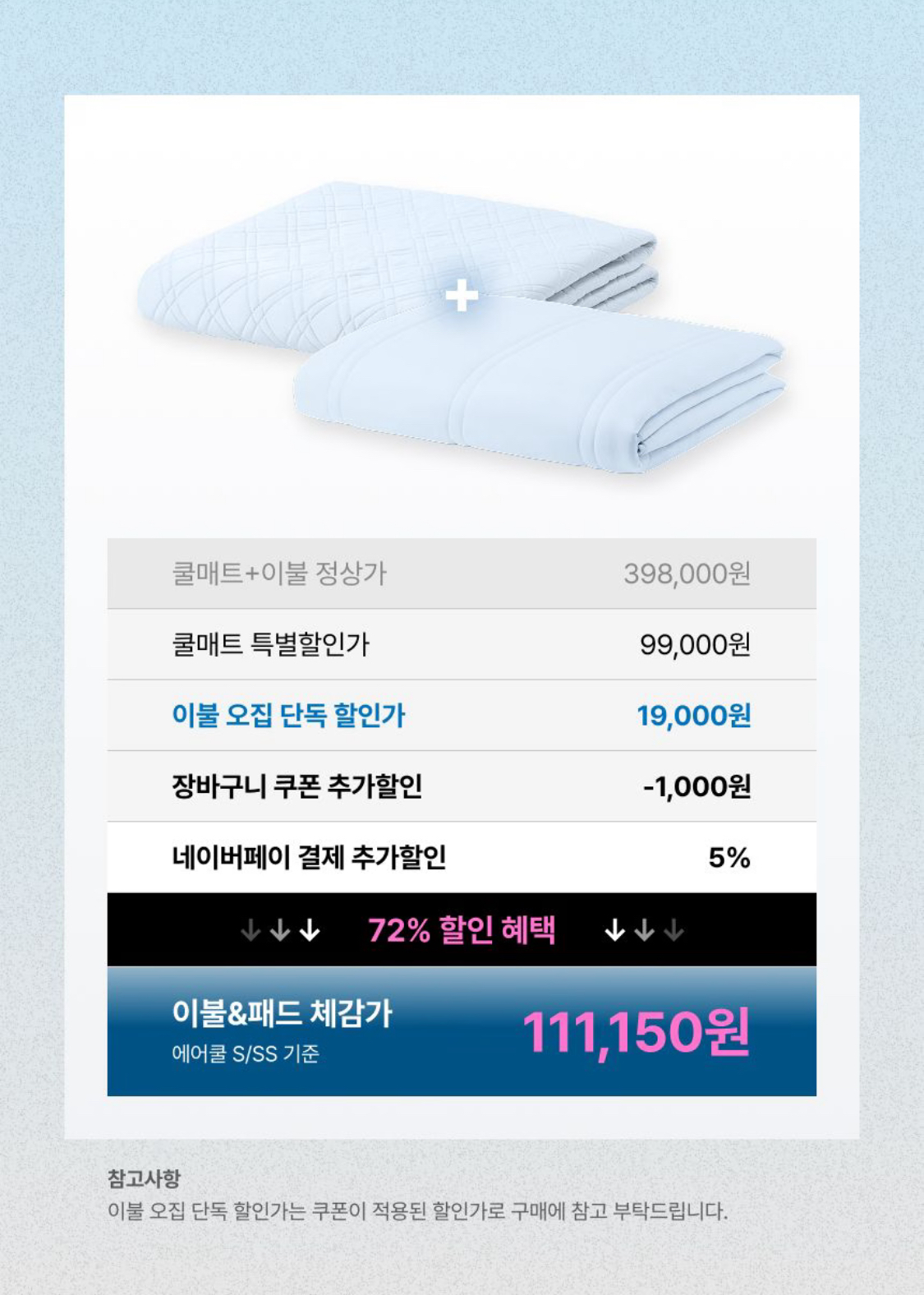 네이버페이로 쿨매트 구매 시 냉감이불 단돈 19,000원에 추가 가능하고