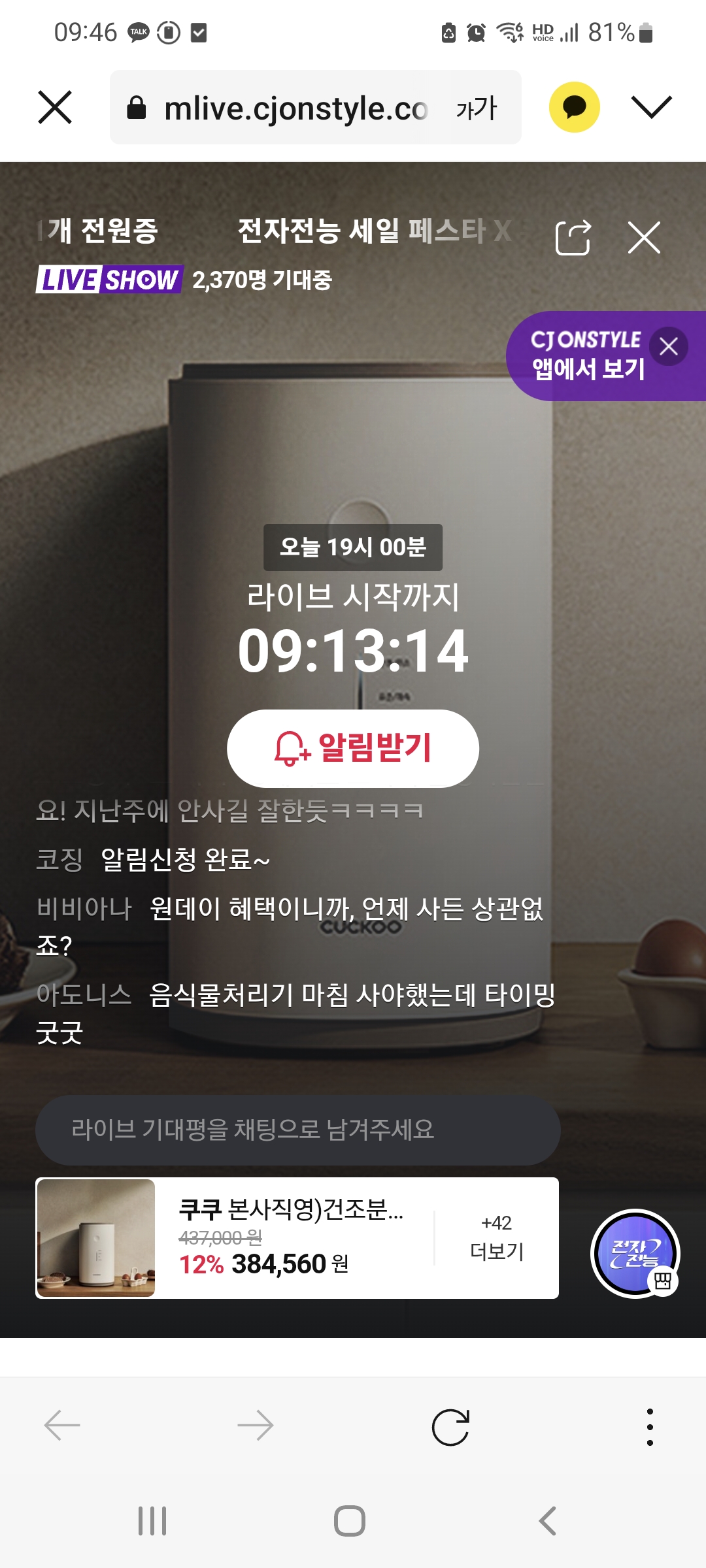 쿠쿠 에코웨일 음식물처리기 7시에 CJ온라이브 특가 335,340원 나옵니다.