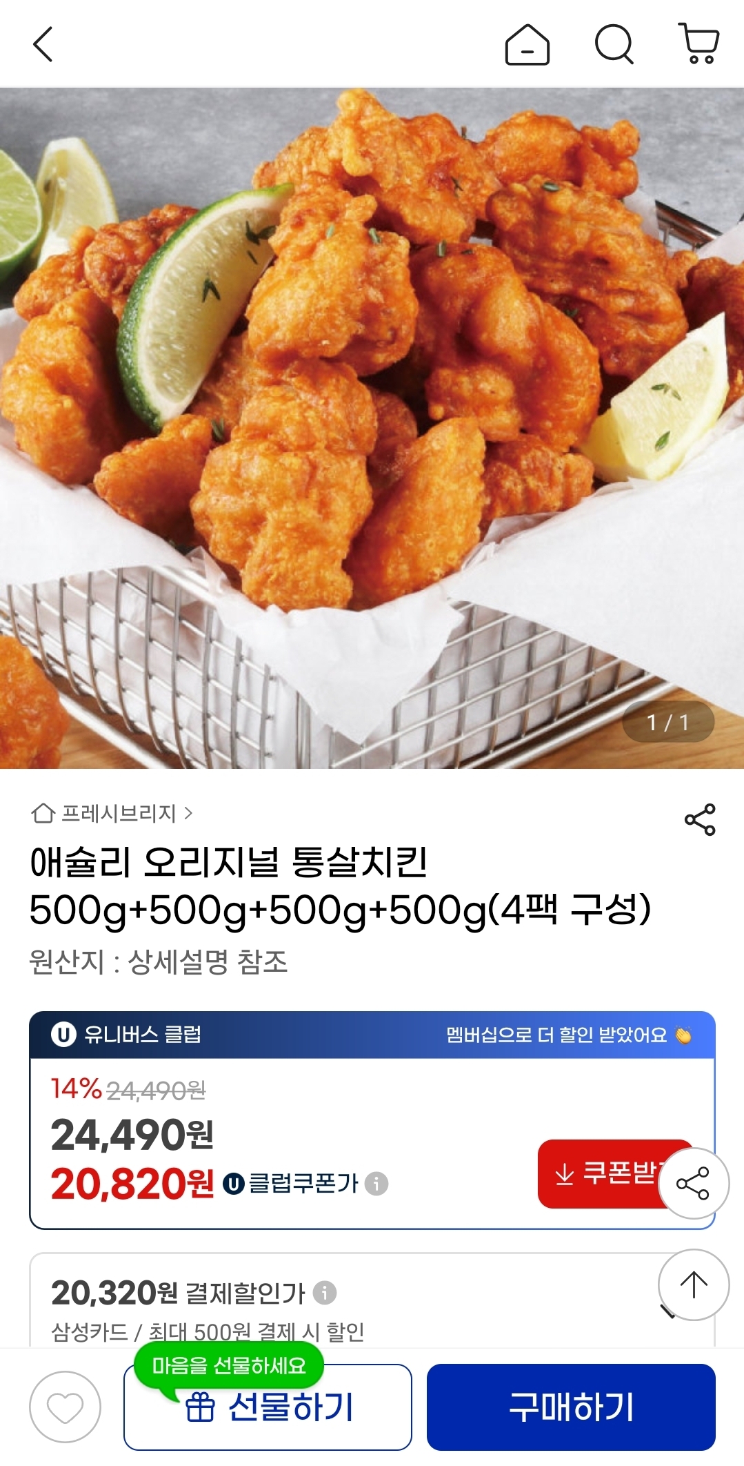 [g마켓] 애슐리 오리지널 통살치킨 2kg(23,270원/무배)