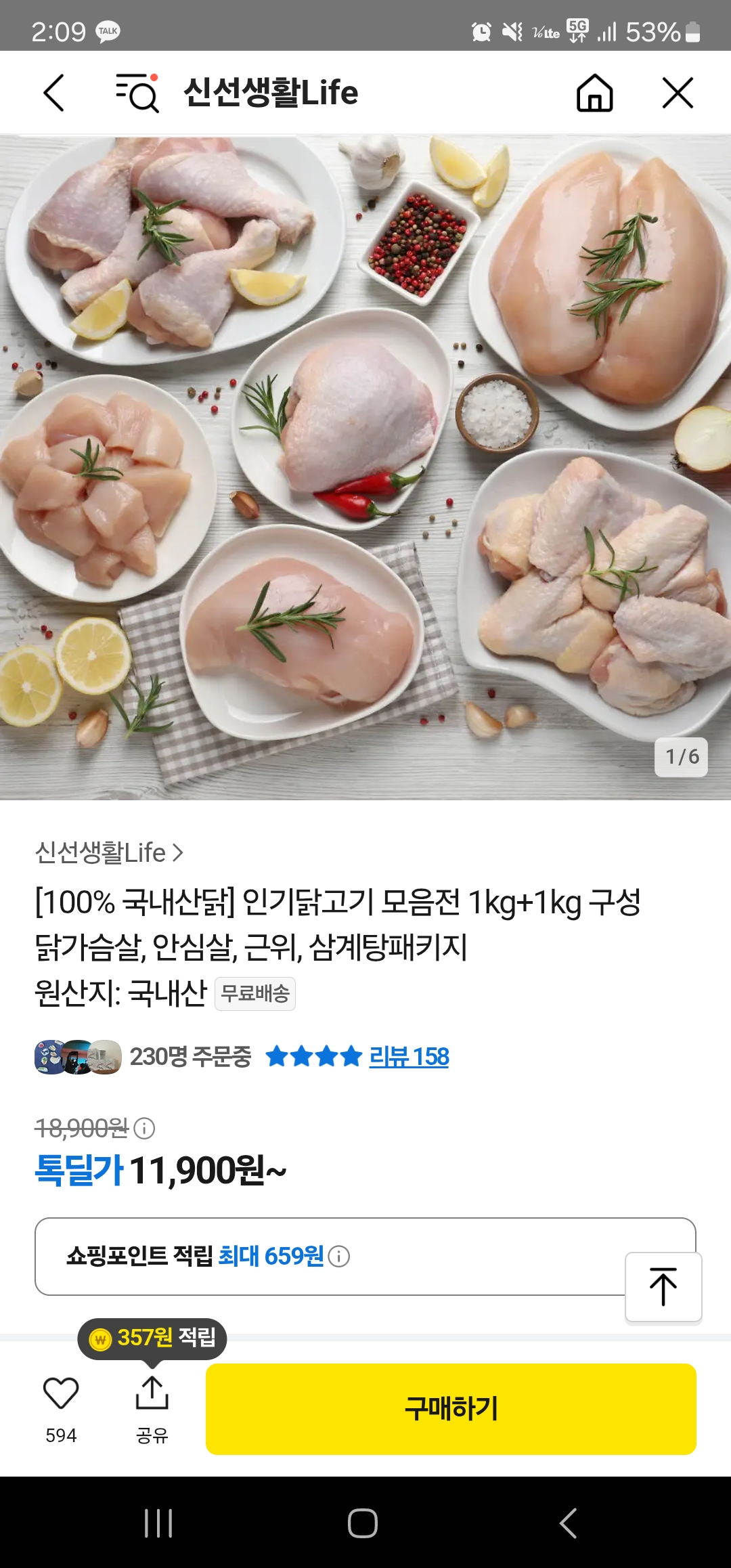 [톡딜] 국내산 닭가슴살 1kg+1kg 2kg 10,900원 무배 > 국내핫딜