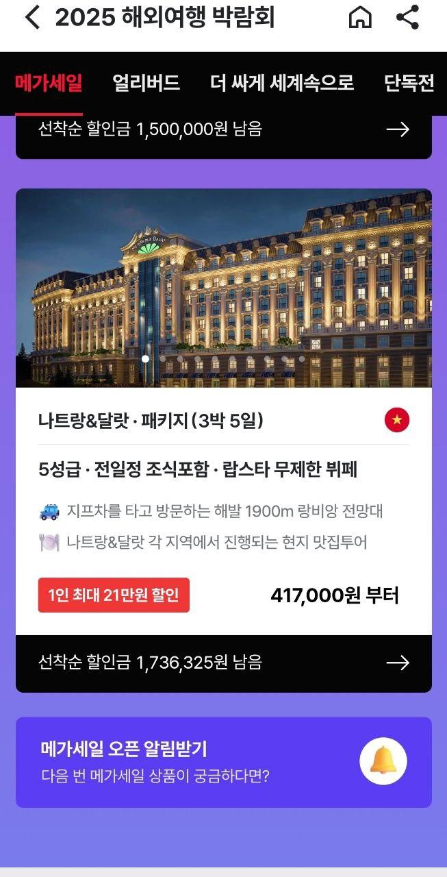 [트립스토어] 나트랑&달랏 3박5일 항공권 5성급호텔+전일정조식+랍스타무제한 풀패키지 (417,000원/무료) > 국내핫딜
