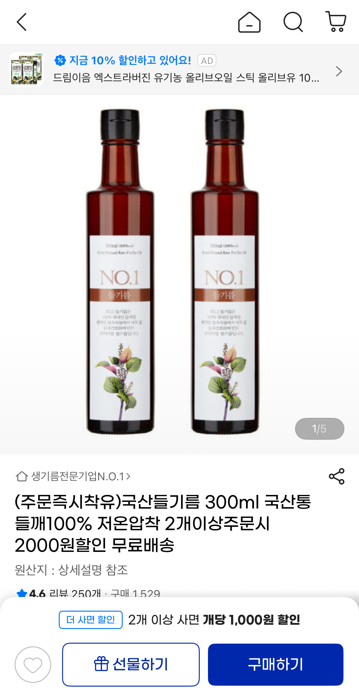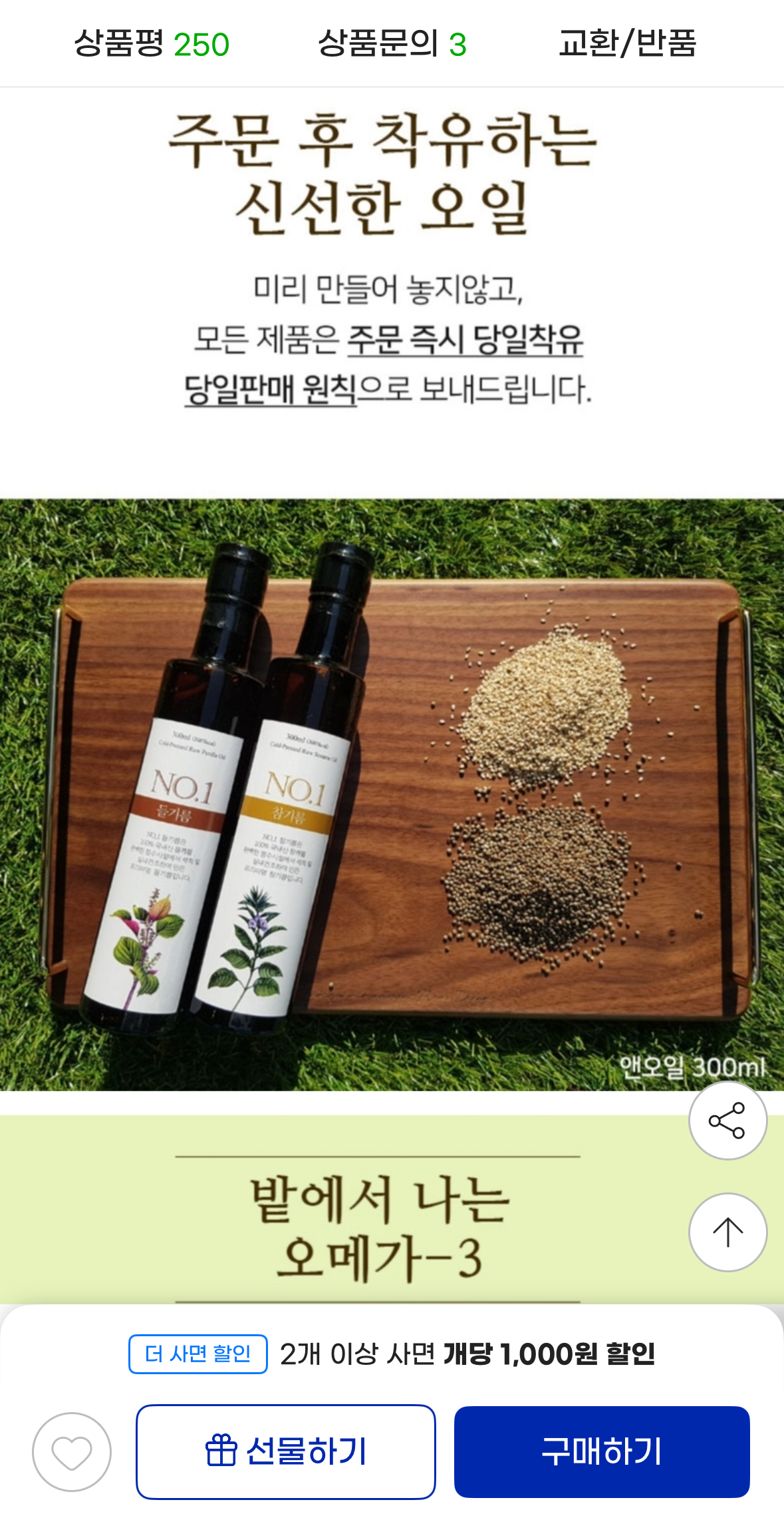 주문 들어오면 생산 시작해서 신선하고 저온압착방식이라 향 더 좋습니다.