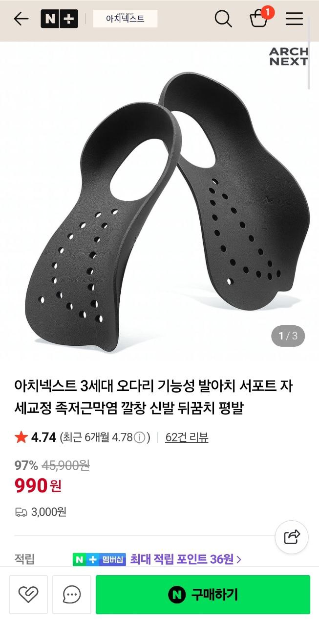 [네이버] 아치넥스트 3세대 기능성 자세교정 족저근막염 깔창 (990원/3000원)