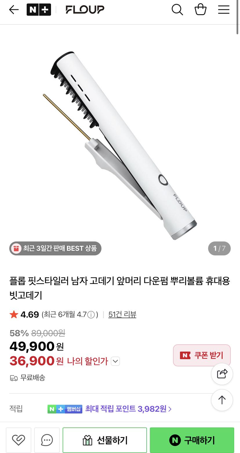 [네이버]플롭 핏스타일러 남자 휴대용 빗고데기 (36,900원/무료)