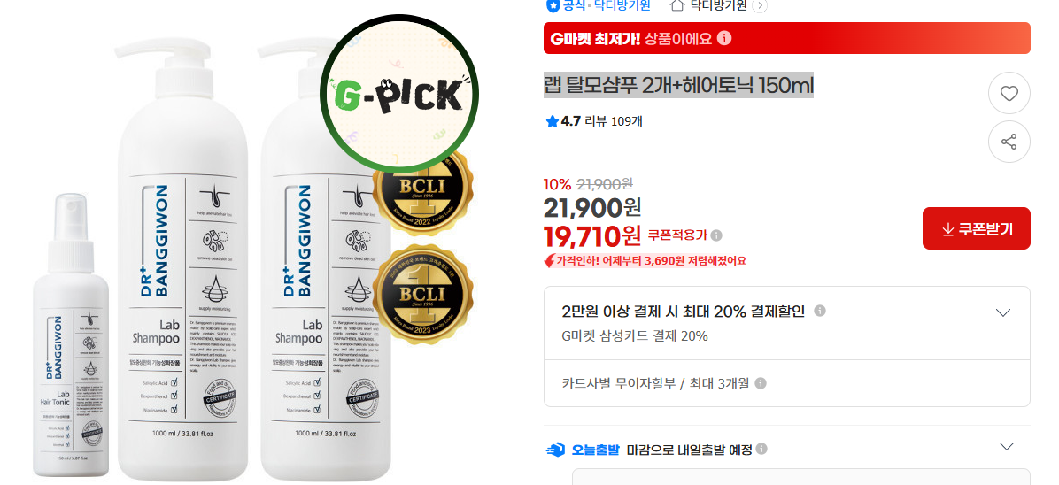 닥터방기원 탈모샴푸 2개에 탈모 두피토닉도 같이 다해서 쿠폰 받으면 19,710원이네요