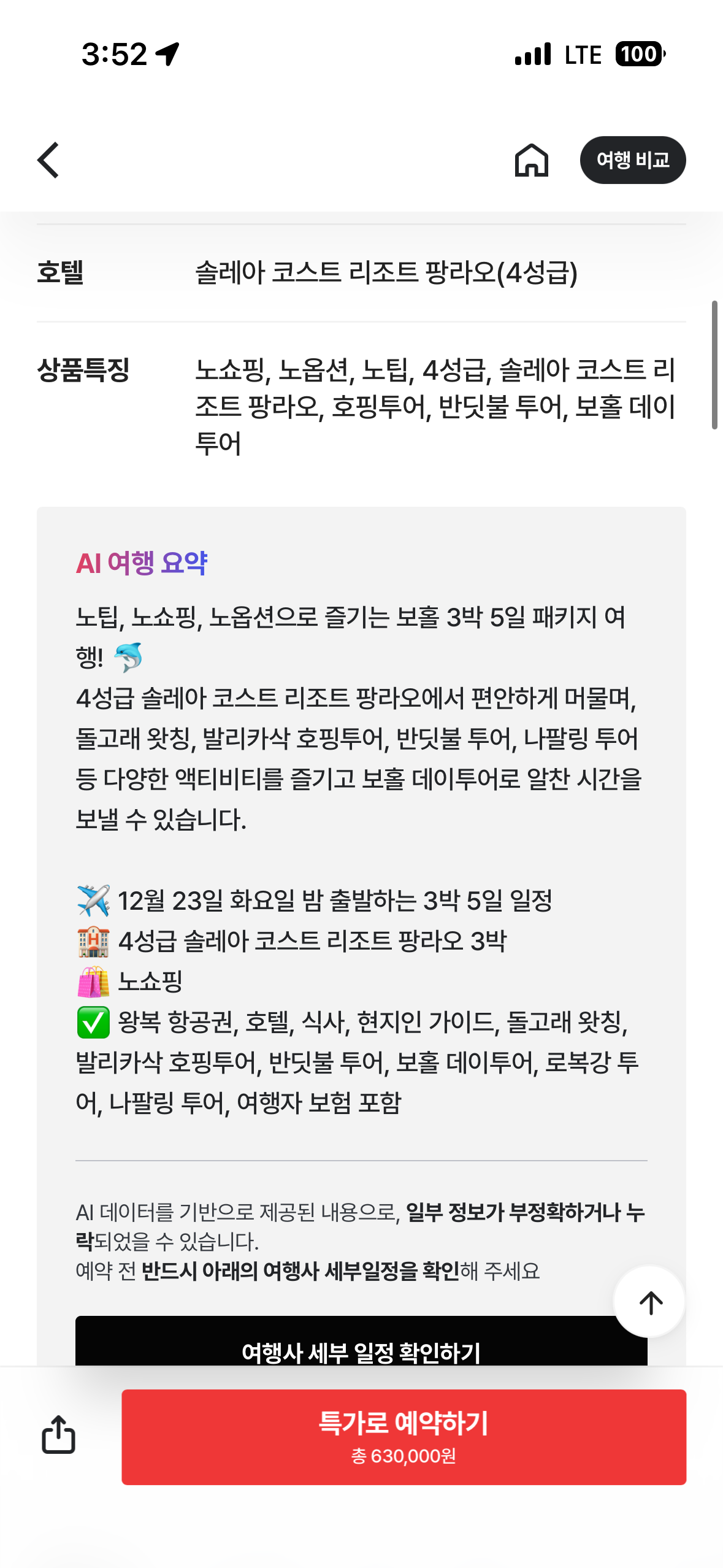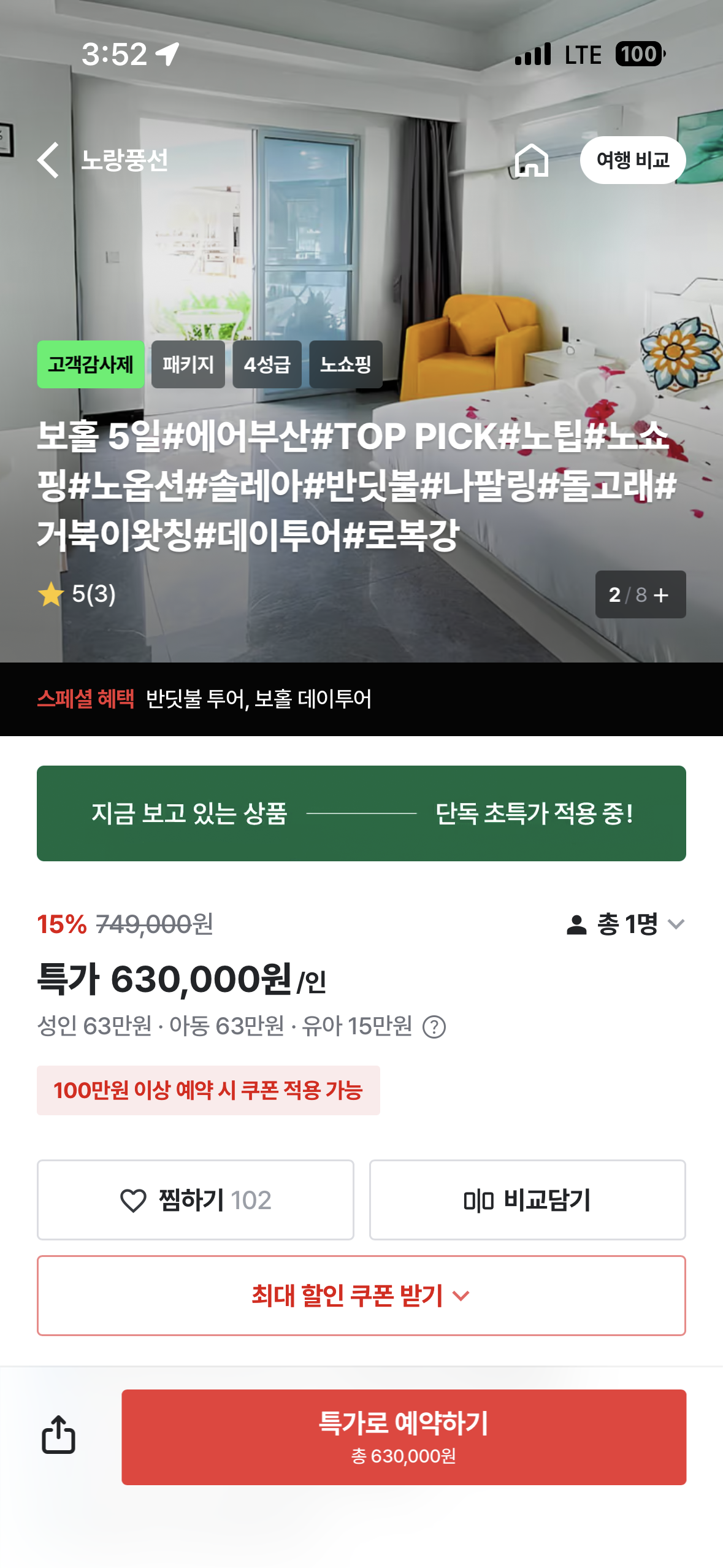 보홀 3 5일 세미패키지 63만원부터 예약 가능하네요