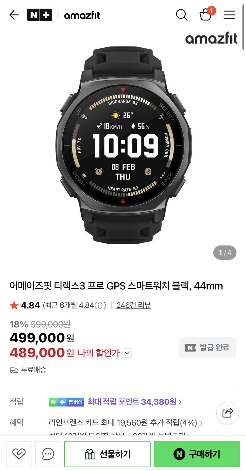 [네이버] 스마트워치 어메이즈핏 티렉스3 프로 44mm 블랙 (489,000원/무료)