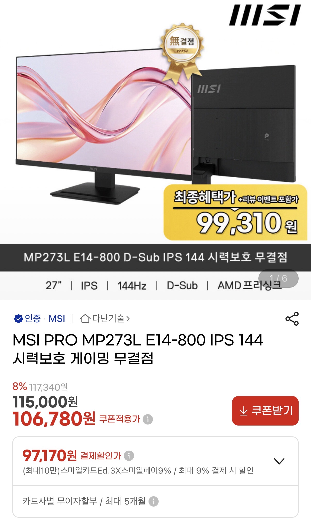 [G마켓] MSI PRO MP273L E14-800 IPS 144 시력보호 게이밍 무결점 모니터 (99,310원/무배) > 국내핫딜