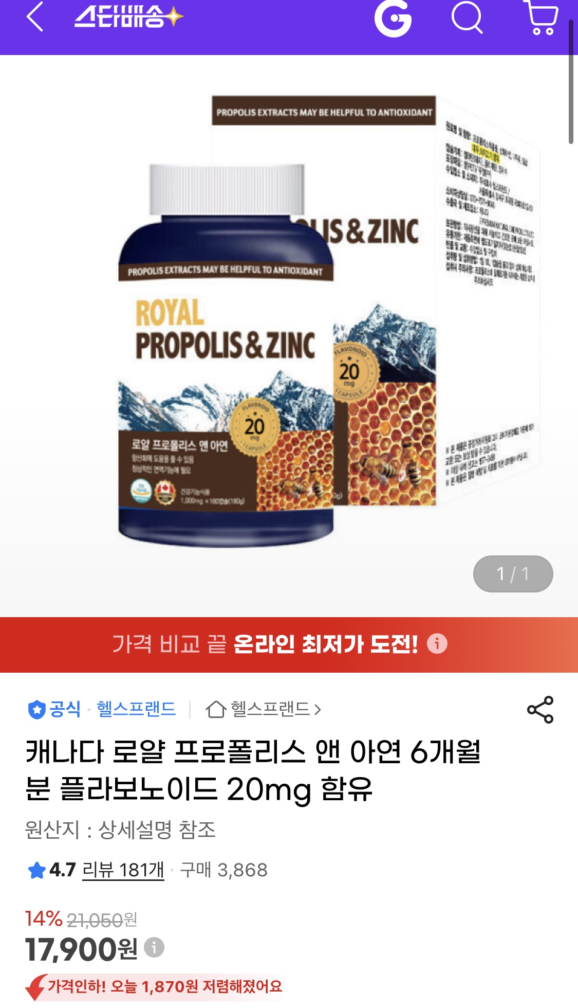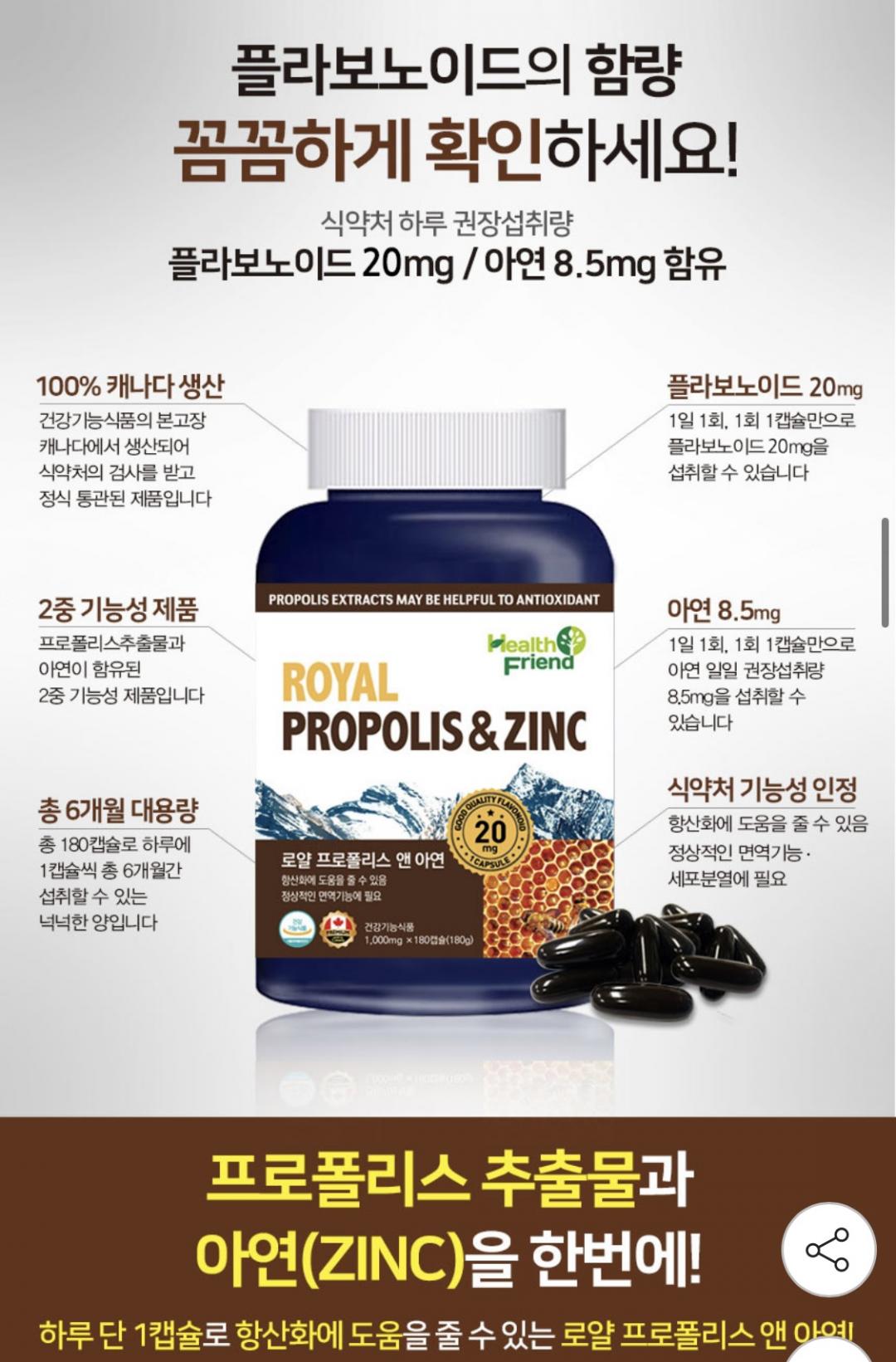 [지마켓] 항산화 로얄 프로폴리스 앤 아연 6개월분 (17,900원/무료)