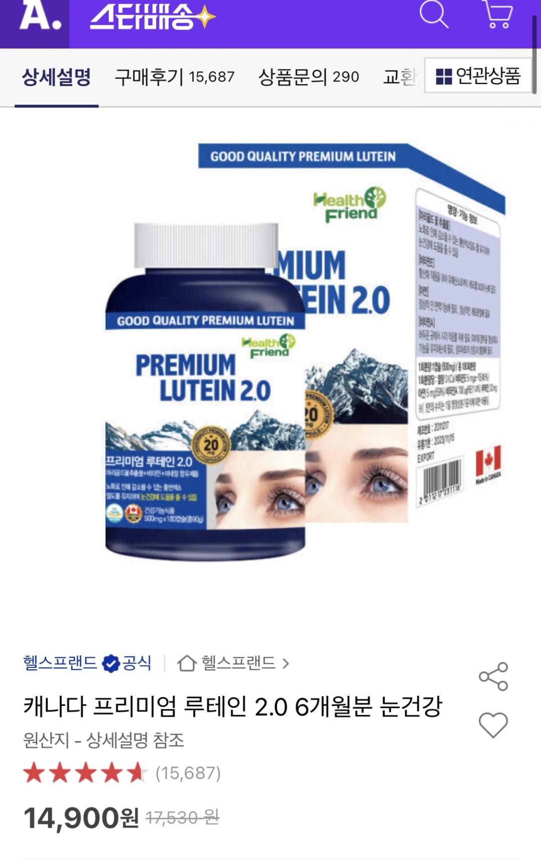 [옥션] 캐나다 직수입 루테인 6개월분 대용량 (14,900원/무료)
