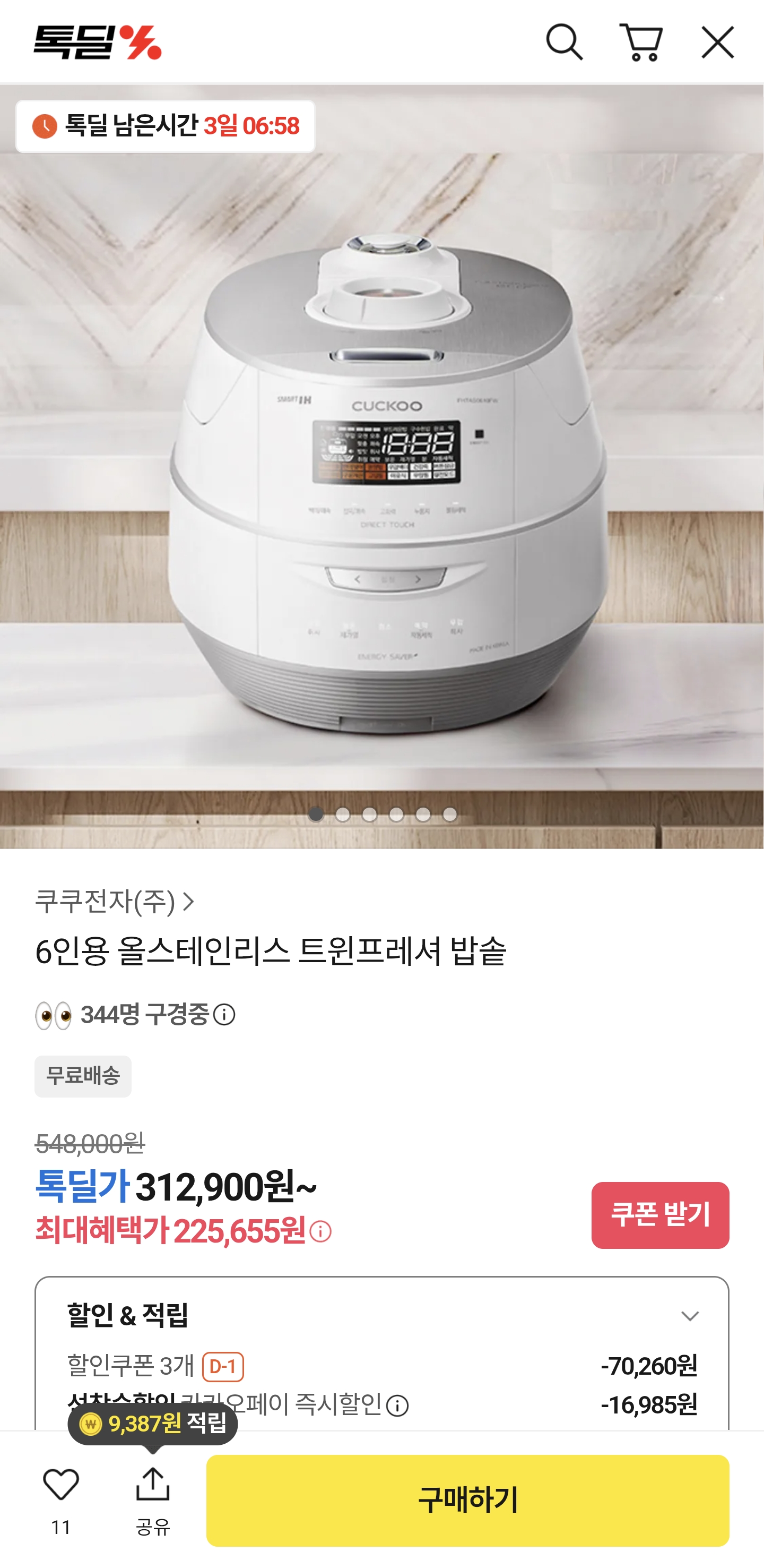 쿠쿠 밥솥 톡딜가 저렴하게 나왔네요