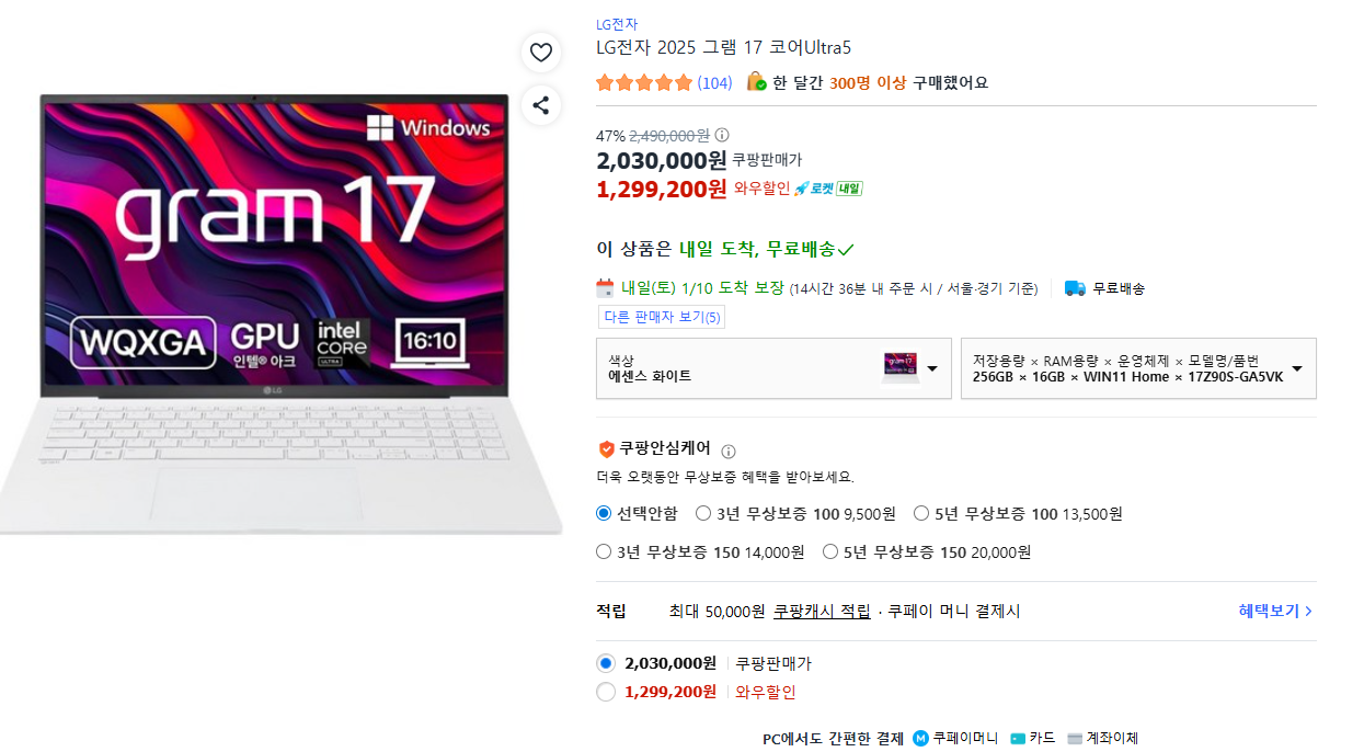 [쿠팡] 엘지 그램 17Z90S-GA5VK (1,299,200원/무료)