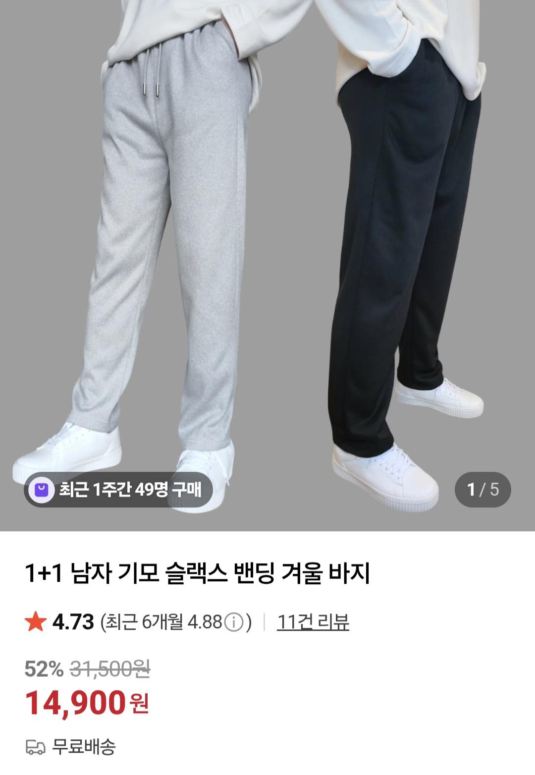 [네이버] 1+1 남자 기모 슬랙스 밴딩 겨울바지 (14,900원/무료)