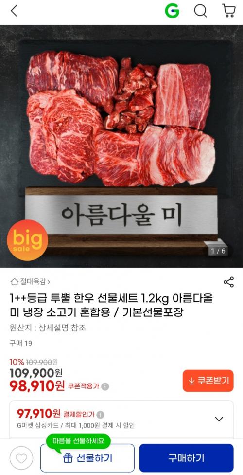 [지마켓] 1++등급 투뿔 한우 선물세트 1.2kg (98,910원 / 무료배송) > 국내핫딜