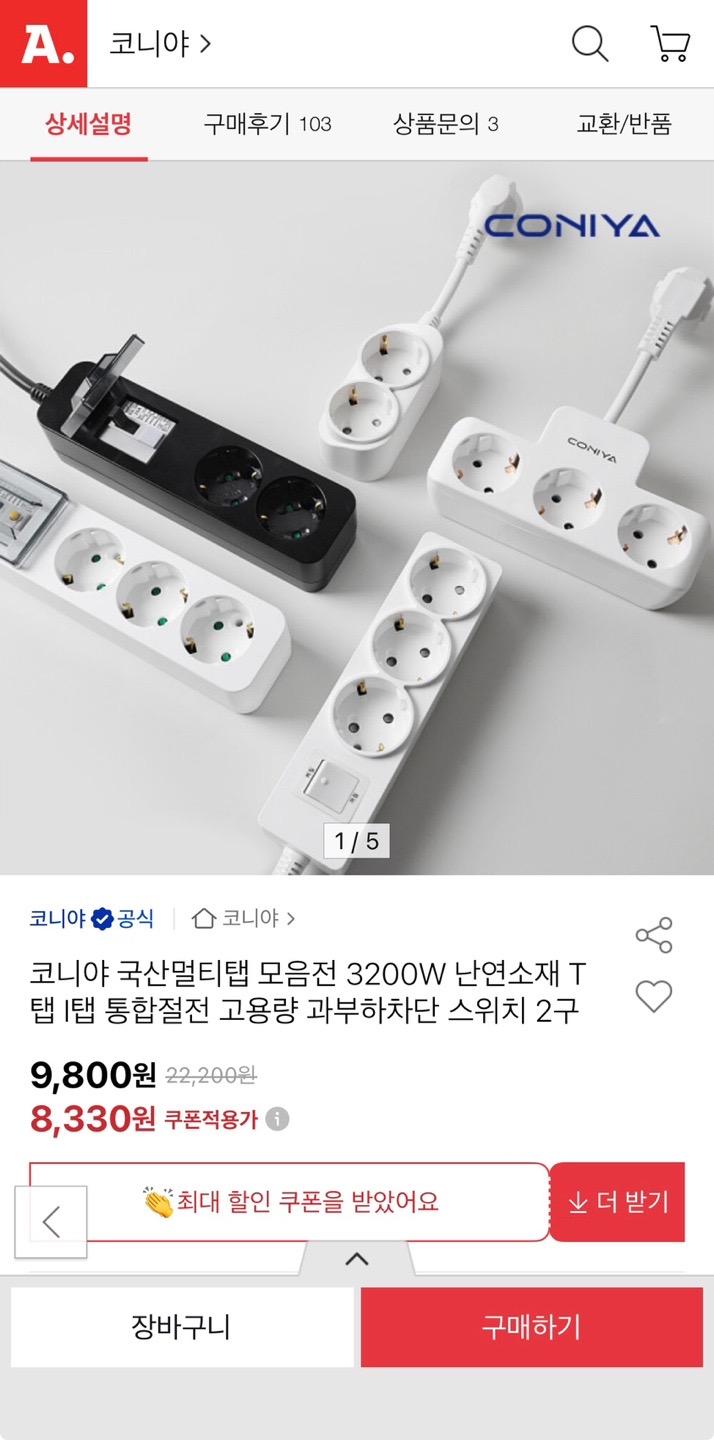 [옥션] 코니야 국산멀티탭 모음전 3200W 난연소재 (8,330원~/무배) > 국내핫딜