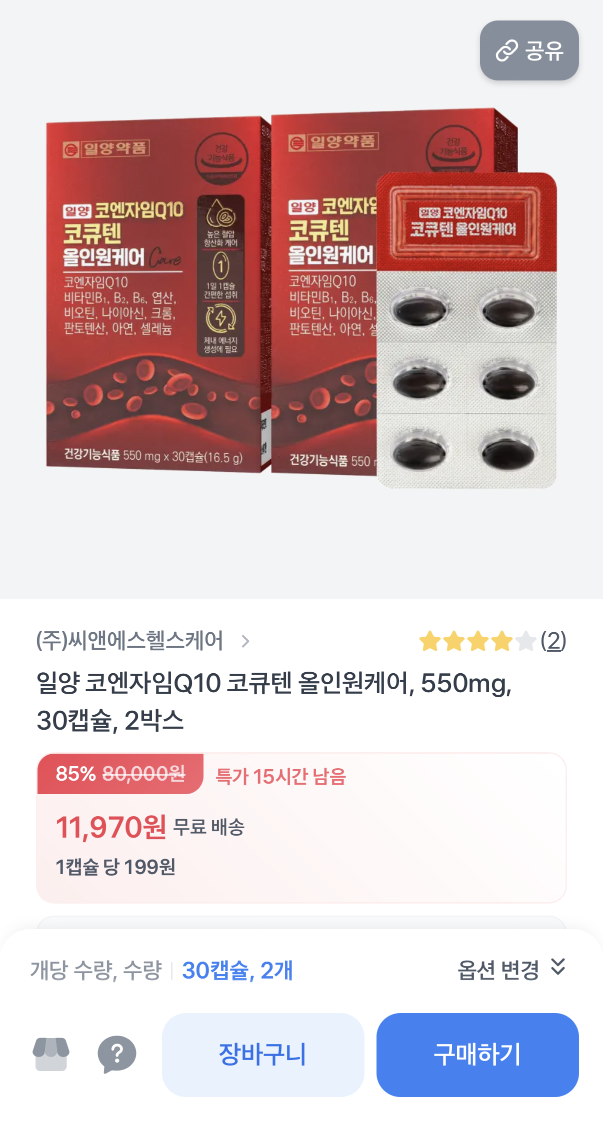 [토스쇼핑] 일양 코엔자임Q10 코큐텐 올인원케어 30캡슐×2박스 (11,970원/무료)