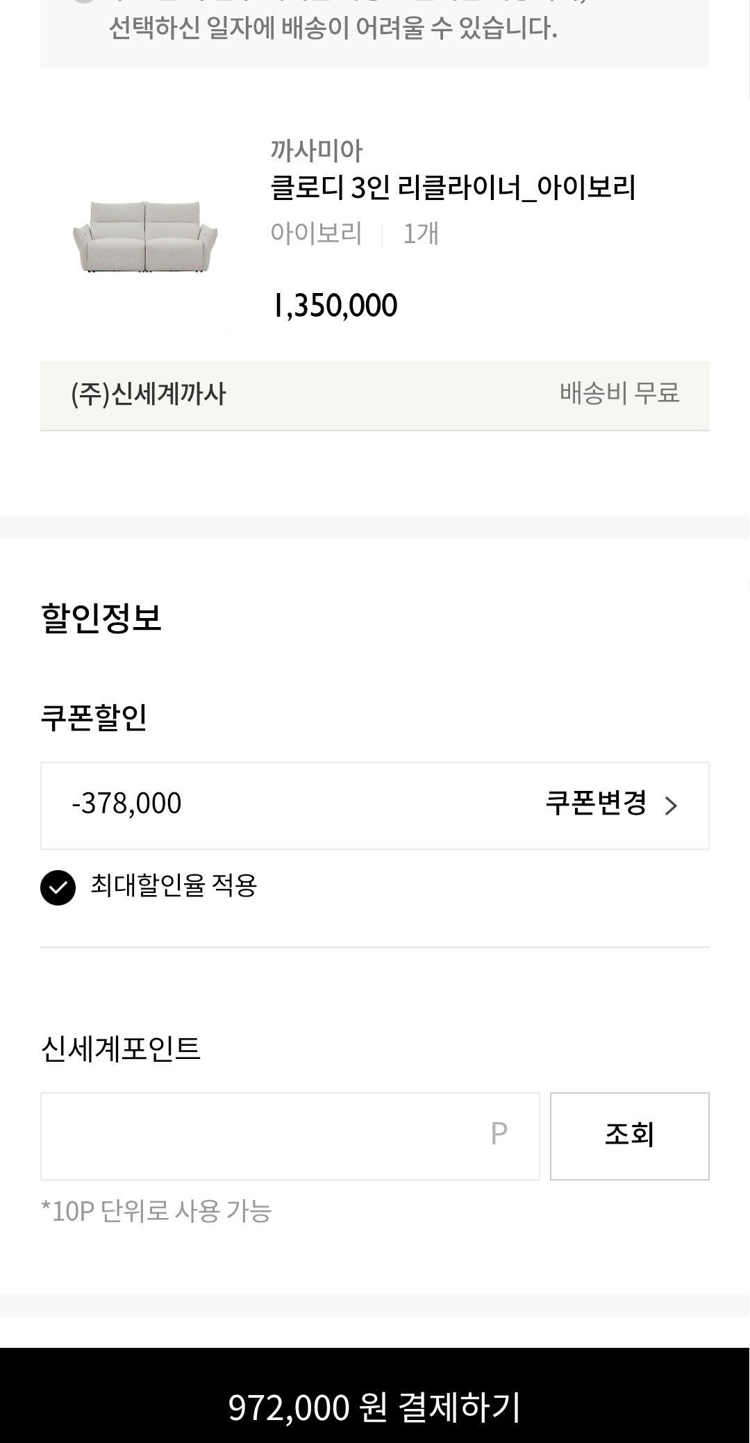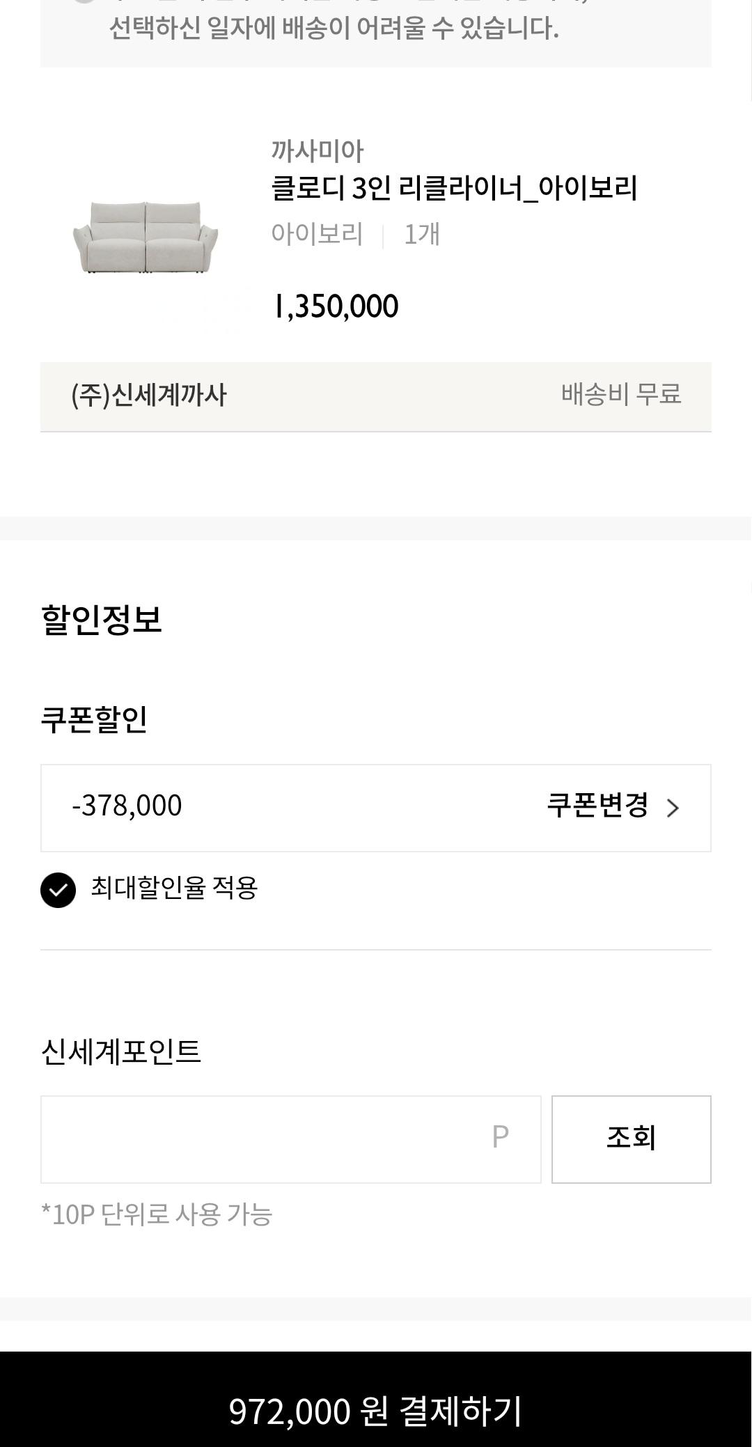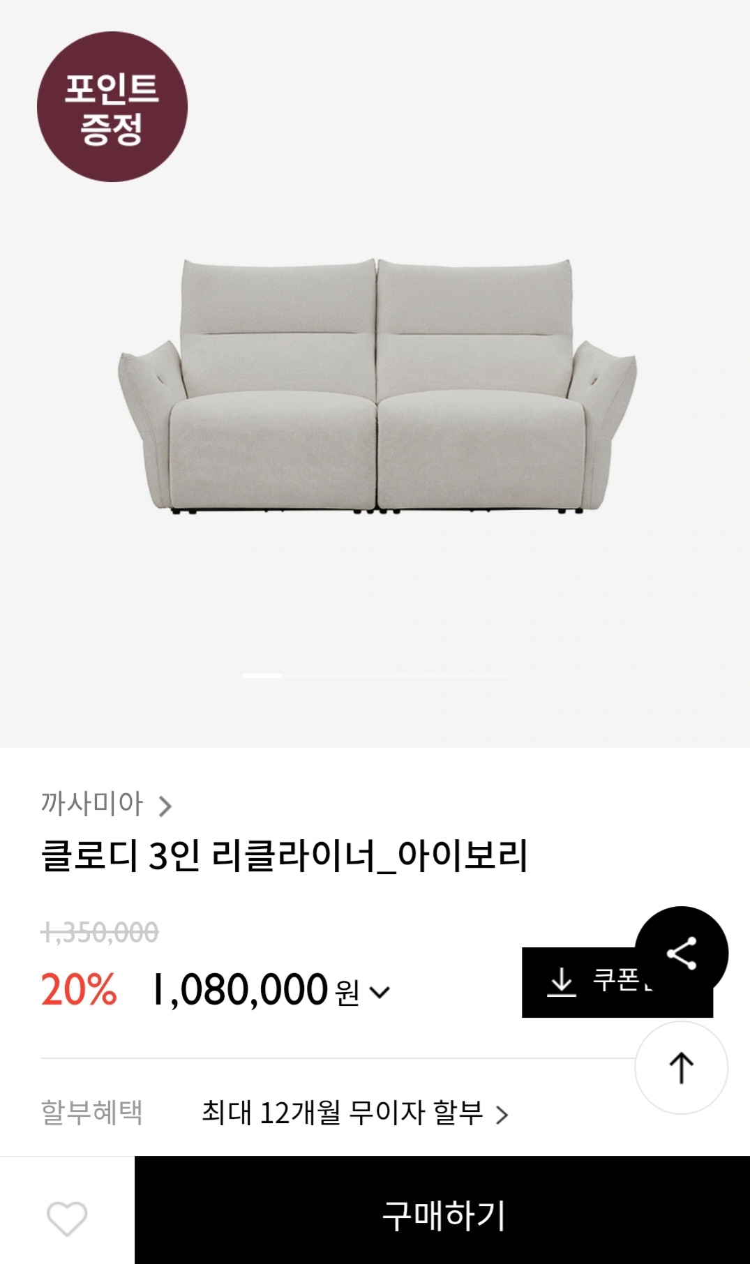 까사미아 신상 리클라이너 소파인데 까사미아몰 단독으로 31일까지 출시 기념으로 20%할인+10%추가 쿠폰 발급+구매확정시 포인트 4만원 페이백 지급