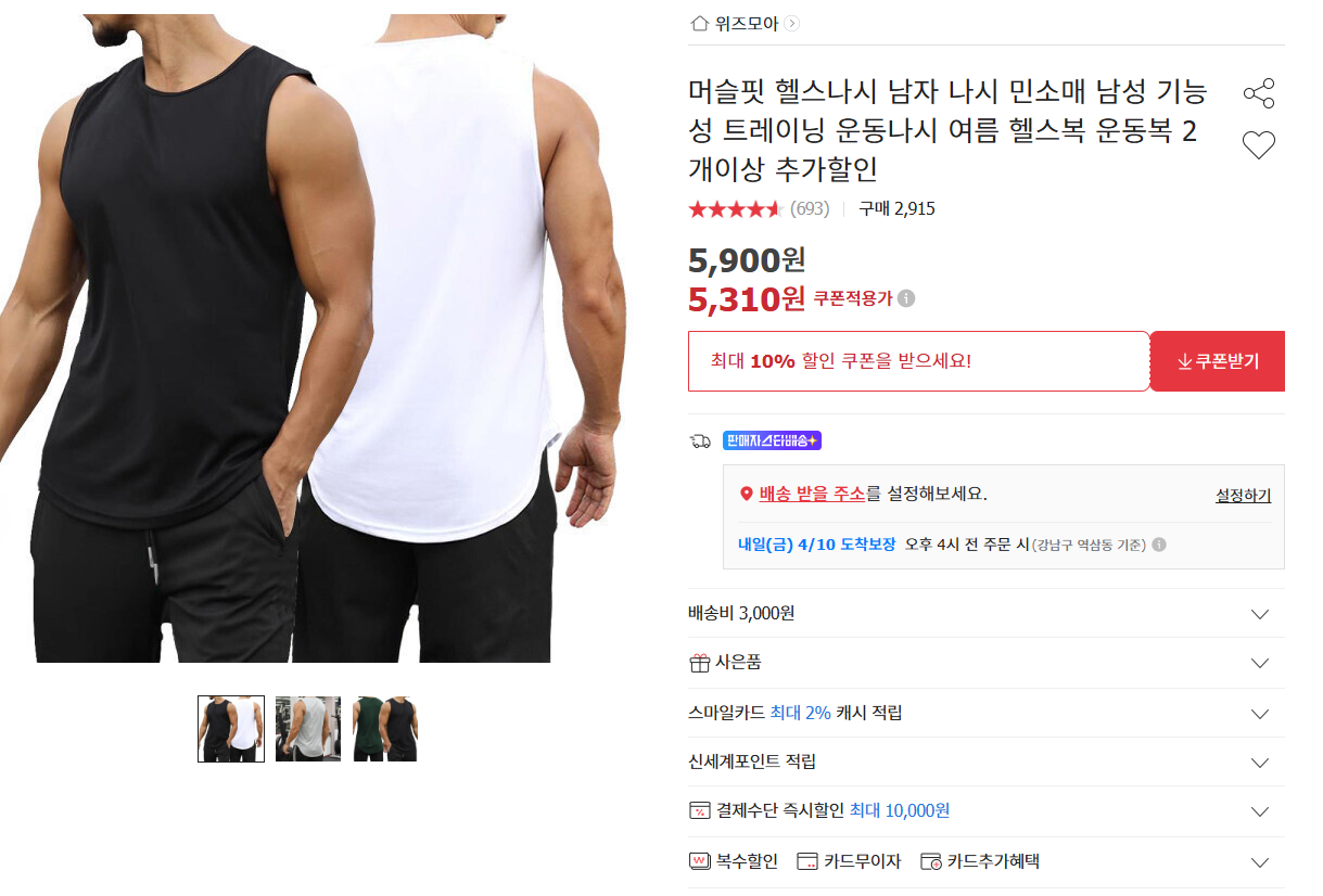 [g마켓] 머슬핏 헬스나시 운동복 5,310원/무배