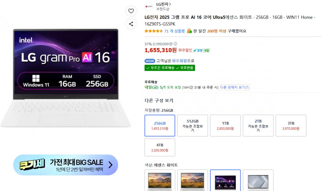 [쿠팡] LG 그램 Pro 16Z90TS-GS5PK (1,655,310원/무료)