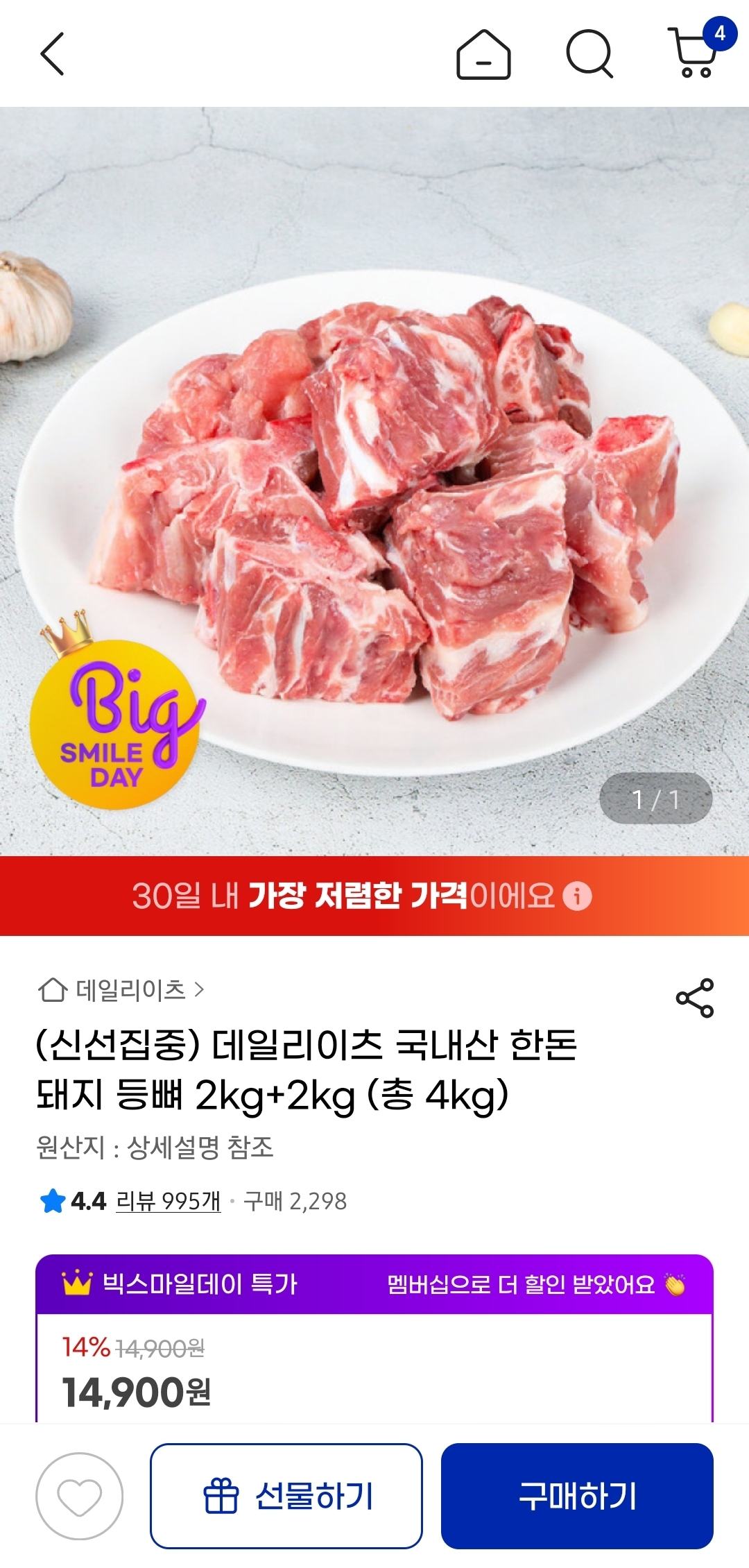 [지마켓] 한돈 돼지 등뼈 총 4kg 13,100원