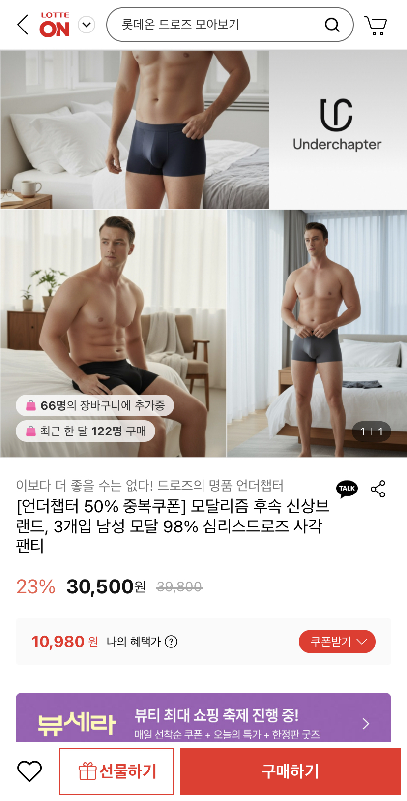 [롯데온]모달리즘 3개입 남성 모달 98% 심리스드로즈 사각팬티 (10,980원/무료)
