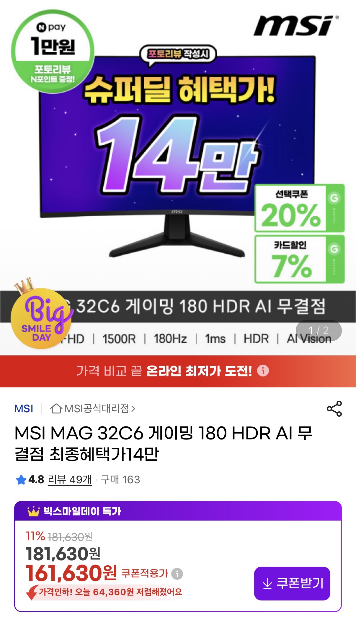 [G마켓] MSI MAG 32C6 게이밍 180 HDR AI 무결점 (150,320원/무배)