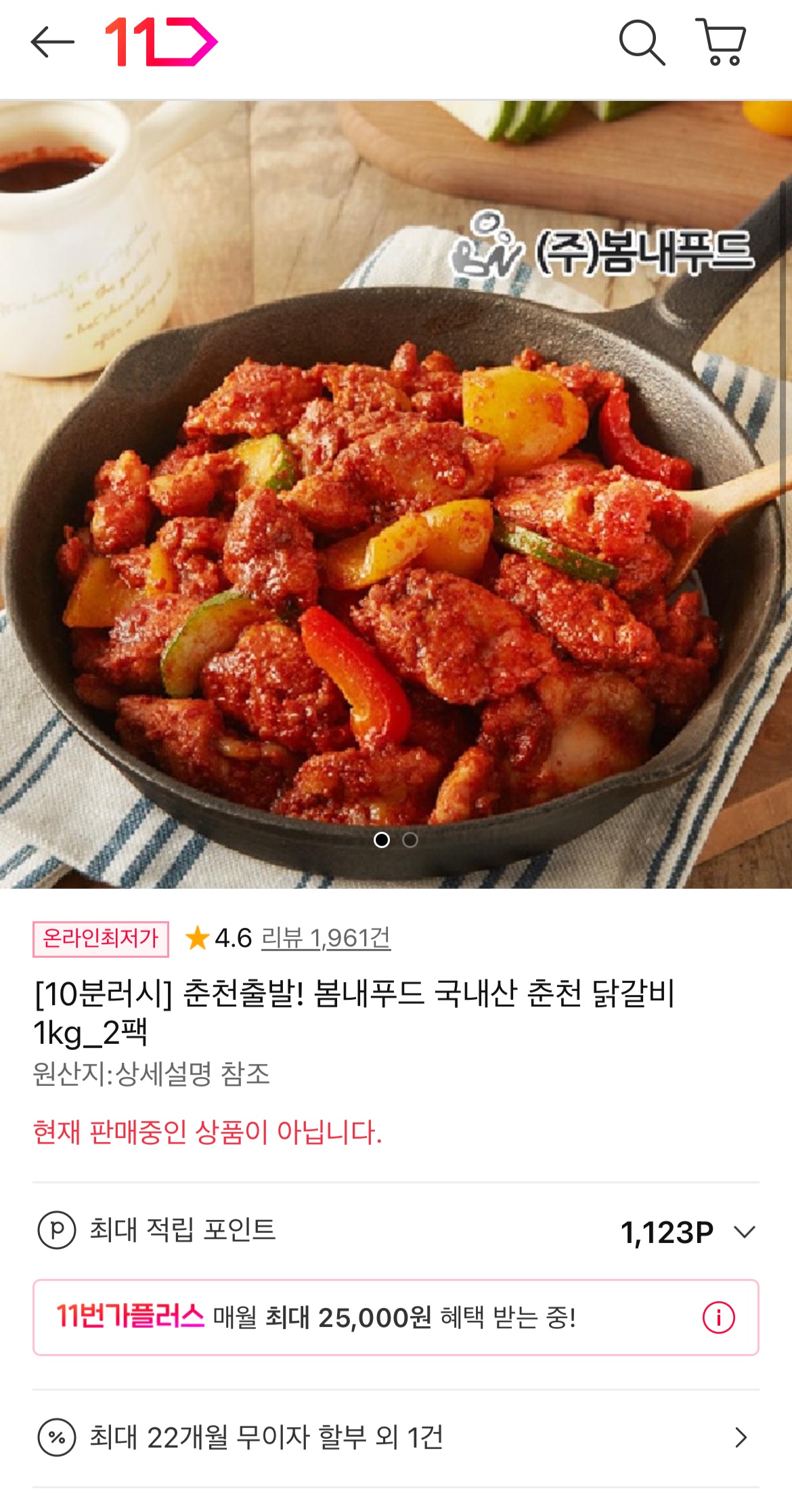 [11번가] 봄내푸드 국내산 춘천 닭갈비 1kg 2팩 (15,900원/무료)