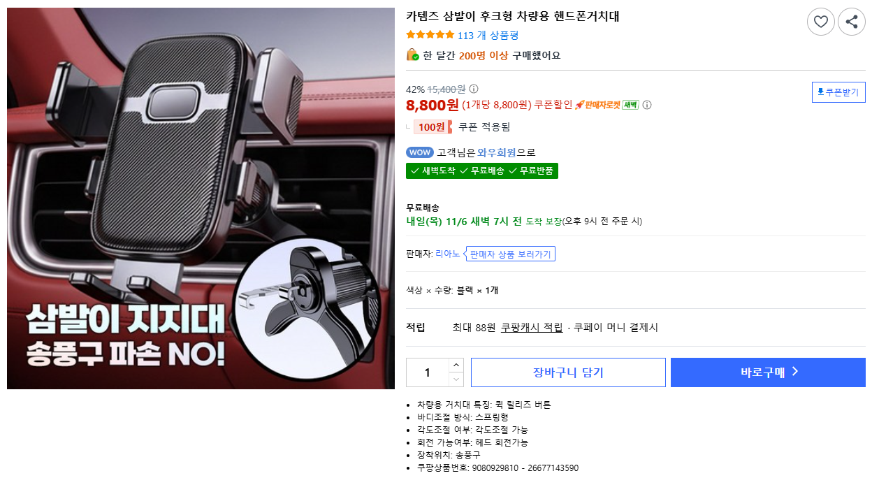 쿠팡)카템즈 삼발이 후크형 차량용거치대 6,800원/무배