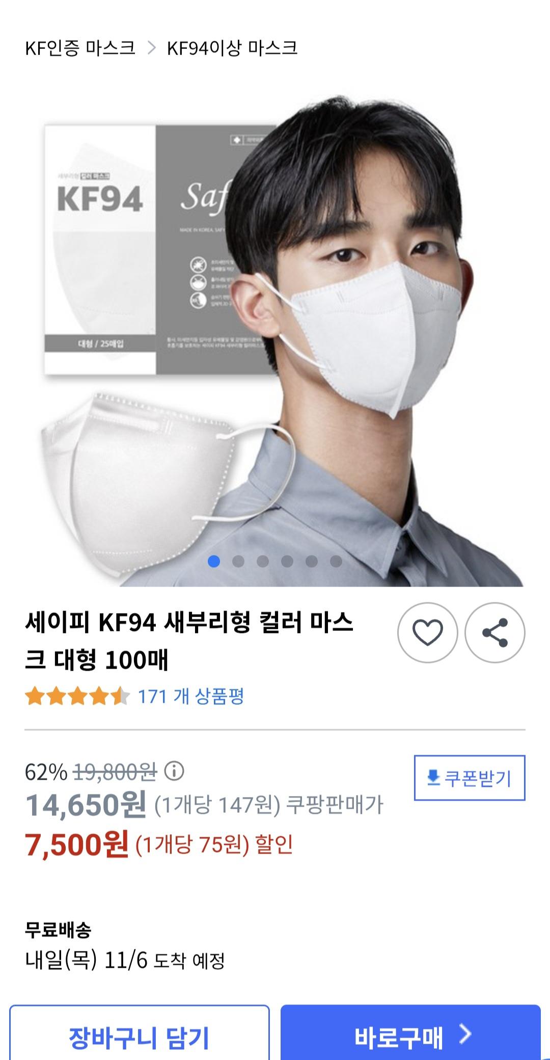 [쿠팡]세이피 국산 KF94 새부리형 컬러 마스크 100매( 7,500원/무배) > 국내핫딜