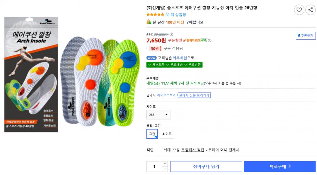 [쿠팡] 에어쿠션 깔창 아치 인솔 7,650원/무배