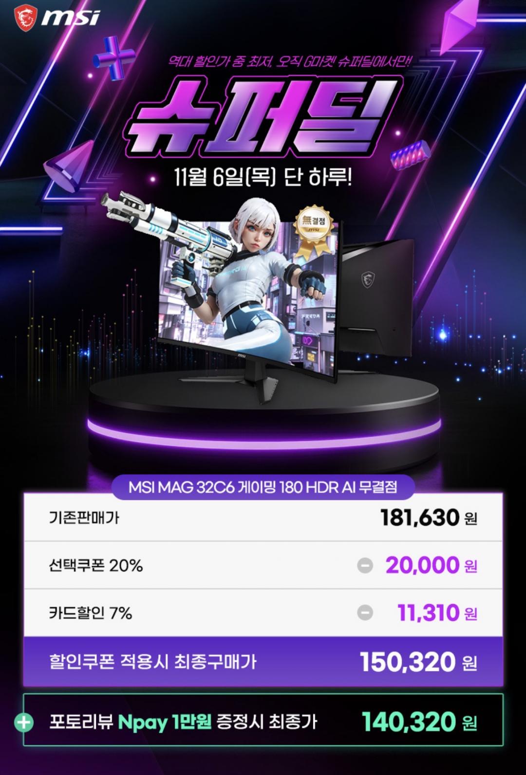 [G마켓] MSI MAG 32C6 게이밍 180 HDR AI 무결점 (150,320원/무배) > 국내핫딜