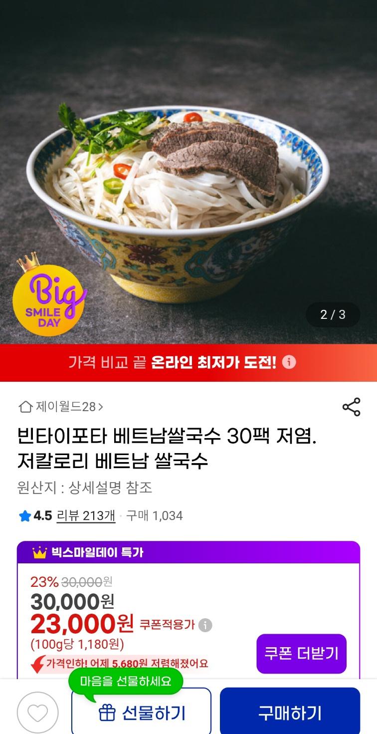 빅스마일데이 쿠폰 + 지마켓 2천원 중복쿠폰 적용시 30팩 23,000원 입니다