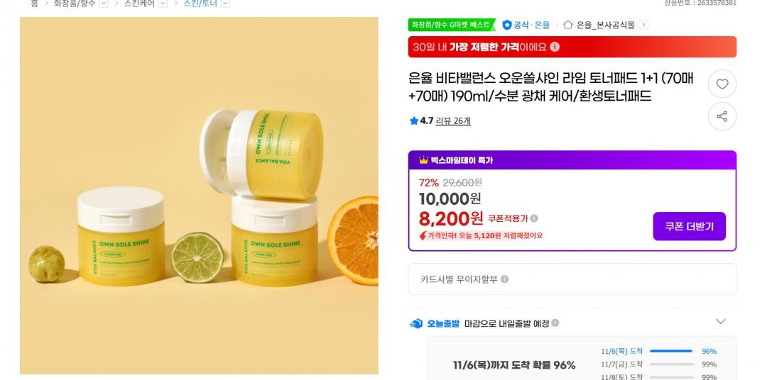 [지마켓] 은율 비타밸런스 오운쏠샤인 라임 토너패드 70매 1+1 (8,200원/무배) > 국내핫딜
