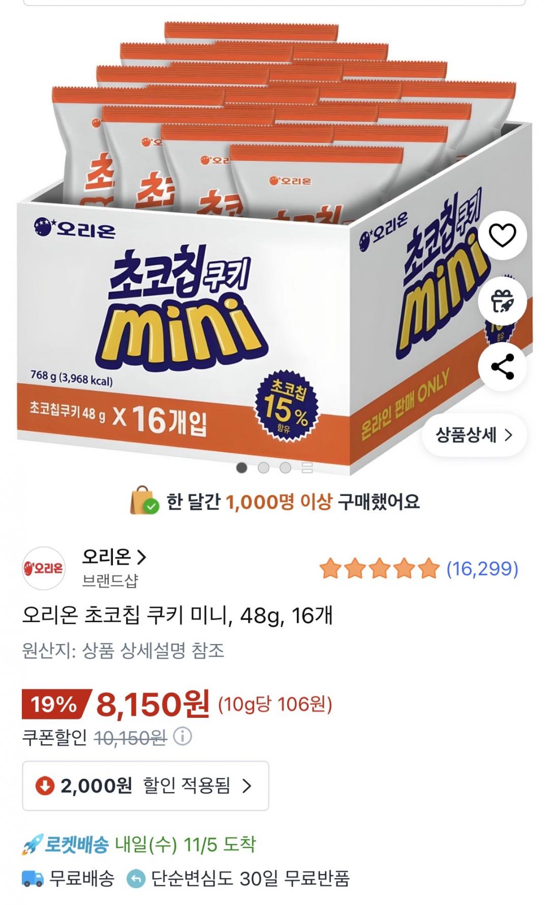 [쿠팡] 오리온 초코칩 쿠키 미니 48g 16개 (8,150원/와우무료)