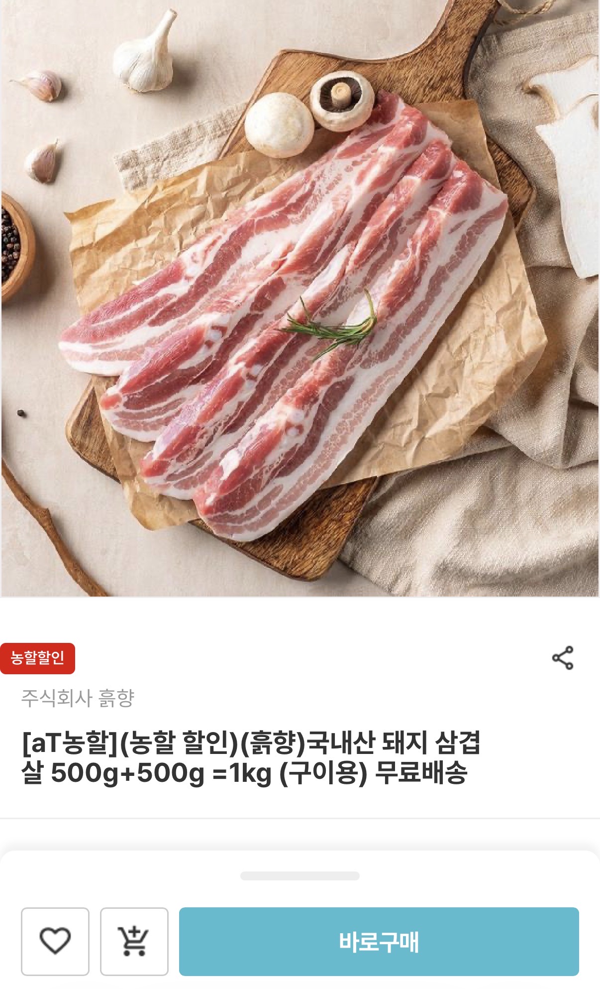 [남도장터] 국내산 삼겹살 1kg (15,840원/무료)